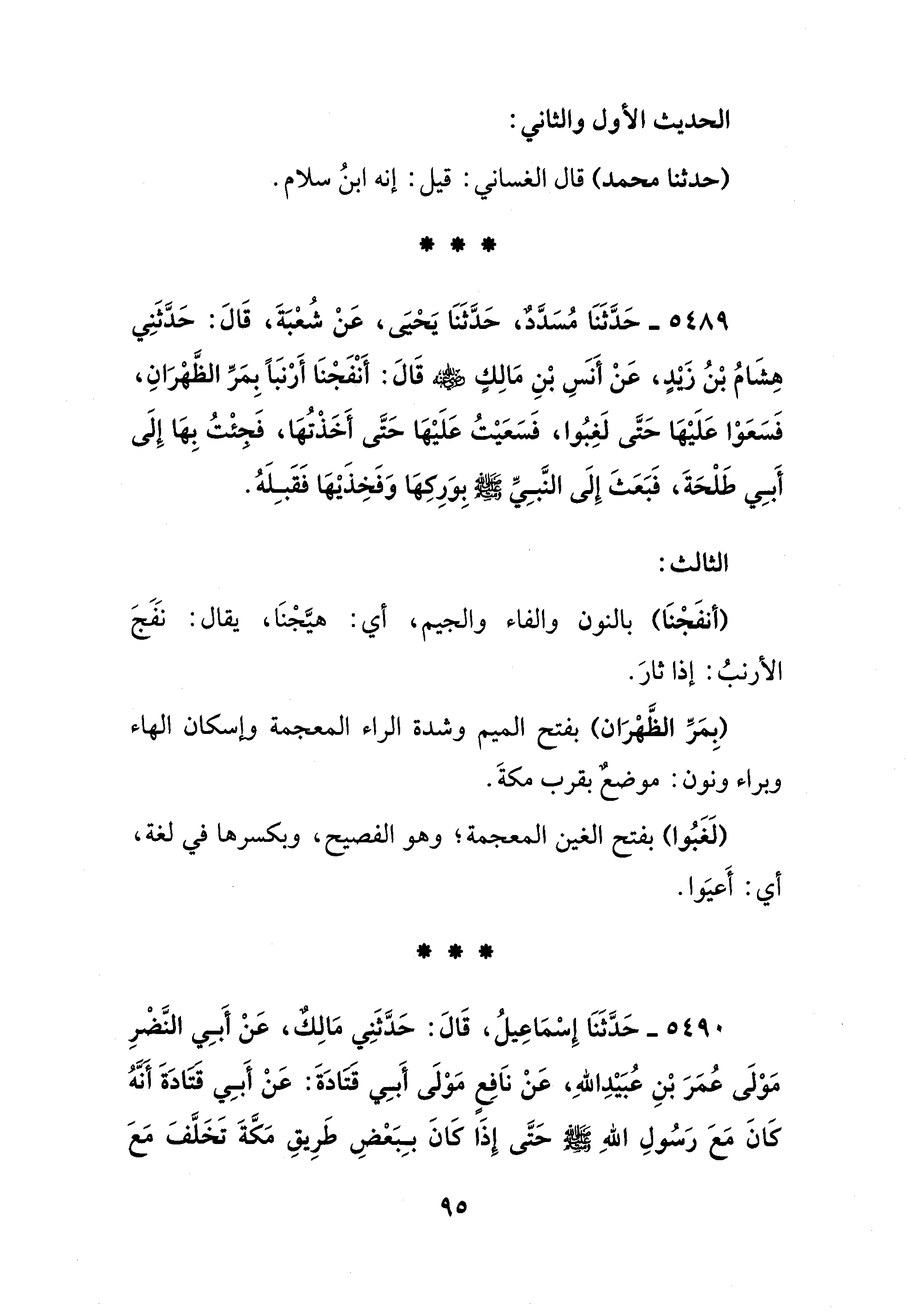 5489 - حَدَّثَنَا مُسَدَّدٌ، حَدَّثَنَا يَحْيَى، عَنْ شُعْبَةَ، قَالَ: حَدَّثَنِي هِشَامُ بْنُ زيدٍ، عَنْ أَنس بْنِ مَالِكٍ - رضي الله عنه - قَالَ: أَنْفَجْنَا أَرْنبًا بِمَرِّ الظَّهْرَانِ، فَسَعَوْا عَلَيْهَا حَتَّى لَغِبُوا، فَسَعَيْتُ عَلَيْهَا حَتَّى أَخَذْتُهَا، فَجئْتُ بِهَا إِلَى أَبِي طَلْحَةَ، فَبَعَثَ إِلَى النَّبِيِّ - صلى الله عليه وسلم - بِوَرِكِهَا وَفَخِذَيْهَا فَقَبِلَهُ.