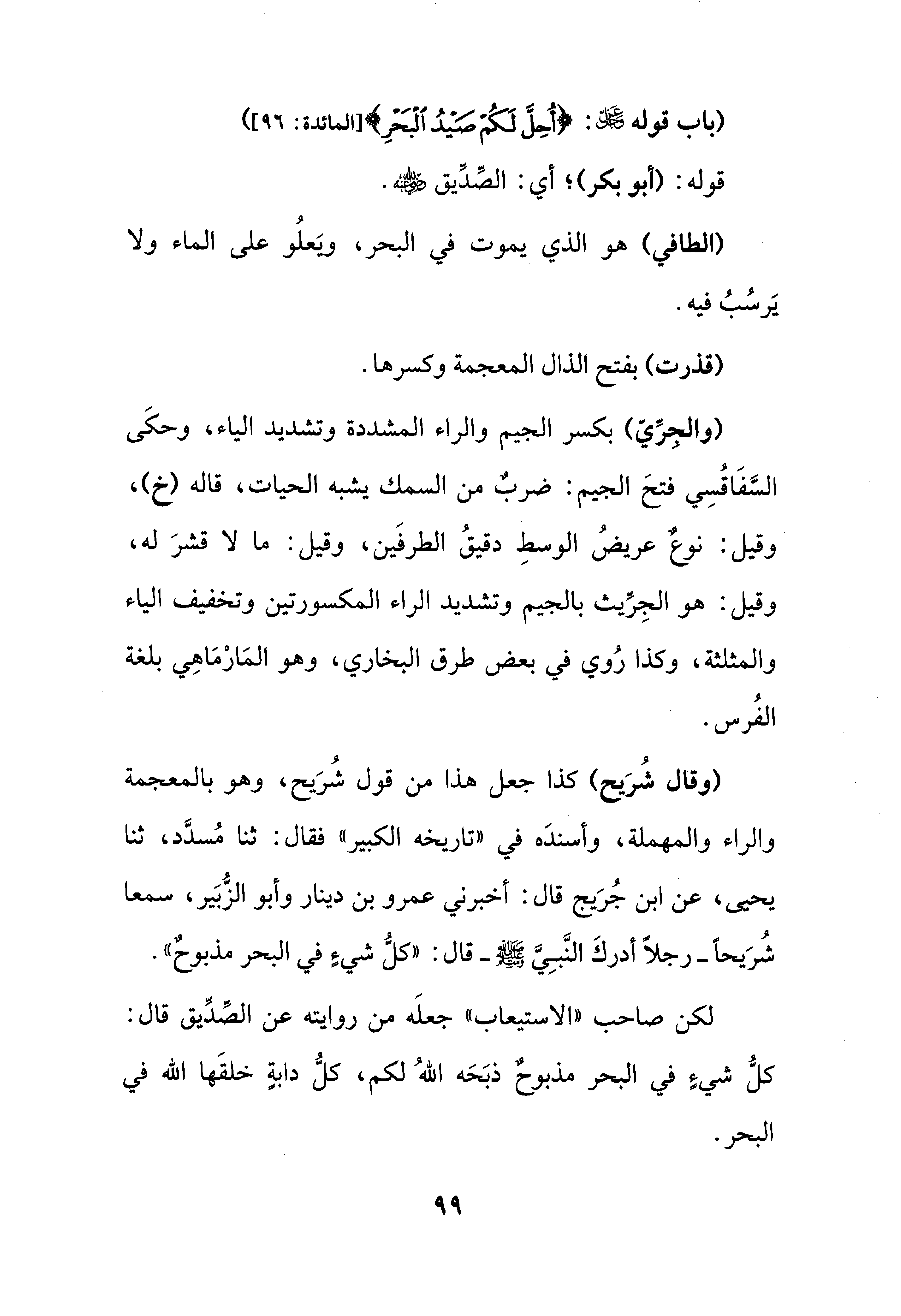 لكن صاحب "الاستيعاب" جعلَه من روايته عن الصِّدِّيق قال: كلُّ شيءٍ في البحر مذبوحٌ ذبَحَه اللهُ لكم، كلُّ دابةٍ خلقَها الله في البحر.