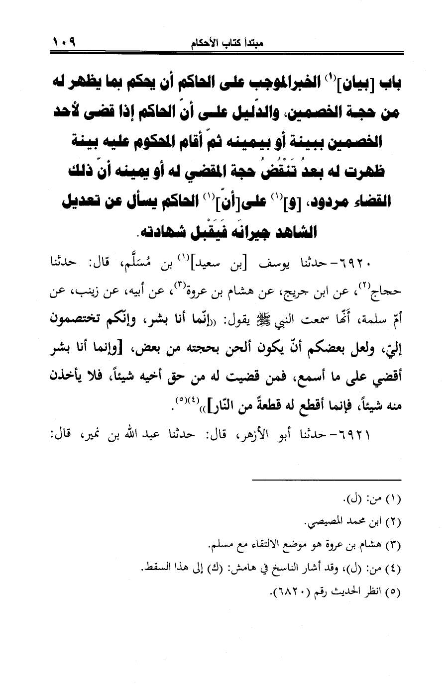 6920 - حدثنا يوسف [بن سعيد] (1) بن مُسَلَّم، قال: حدثنا حجاج (¬1)، عن ابن جريج، عن هشام بن عروة (¬2)، عن أبيه، عن زينب، عن أمّ سلمة، أَنها سمعت النبي -صلى الله عليه وسلم- يقول: "إنّما أنا بشر، وإنكم تختصمون إليّ، ولعل بعضكم أنّ يكون ألحن بحجته من بعض، [وإنما أنا بشر أقضي على ما أسمع، فمن قضيت له من حق أخيه شيئًا، فلا يأخذن منه شيئًا، فإنما أقطع له قطعةً من النّار] " (¬3) (¬4).