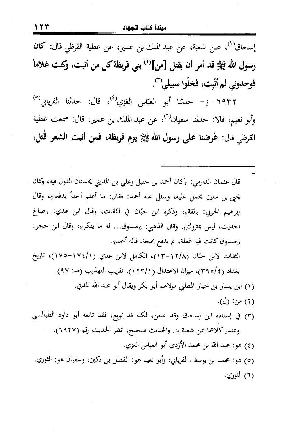6932 - ز- حدثنا أبو العبّاس الغزي (¬1)، قال: حدثنا الفريابي (¬2) وأبو نعيم، قالا: حدثنا سفيان (¬3)، عن عبد الملك بن عمير، قال: سمعت عطية القرظي قال: عُرضنا على رسول الله -صلى الله عليه وسلم- يوم قريظة، فمن أنبت الشعر قُتل،
