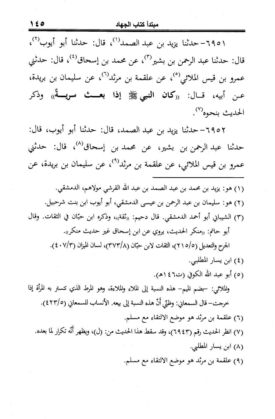 6951 - حدثنا يزيد بن عبد الصمد (¬1)، قال: حدثنا أبو أيوب (¬2)، قال: حدثنا عبد الرحمن بن بشير (¬3)، عن محمد بن إسحاق (¬4)، قال: حدثني عمرو بن قيس الملائي (¬5)، عن علقمة بن مرثد (¬6)، عن سليمان بن بريدة، عن أبيه، قال: "كان النبي -صلى الله عليه وسلم- إذا بعث سريةً" وذكر الحديث بنحوه (¬7).