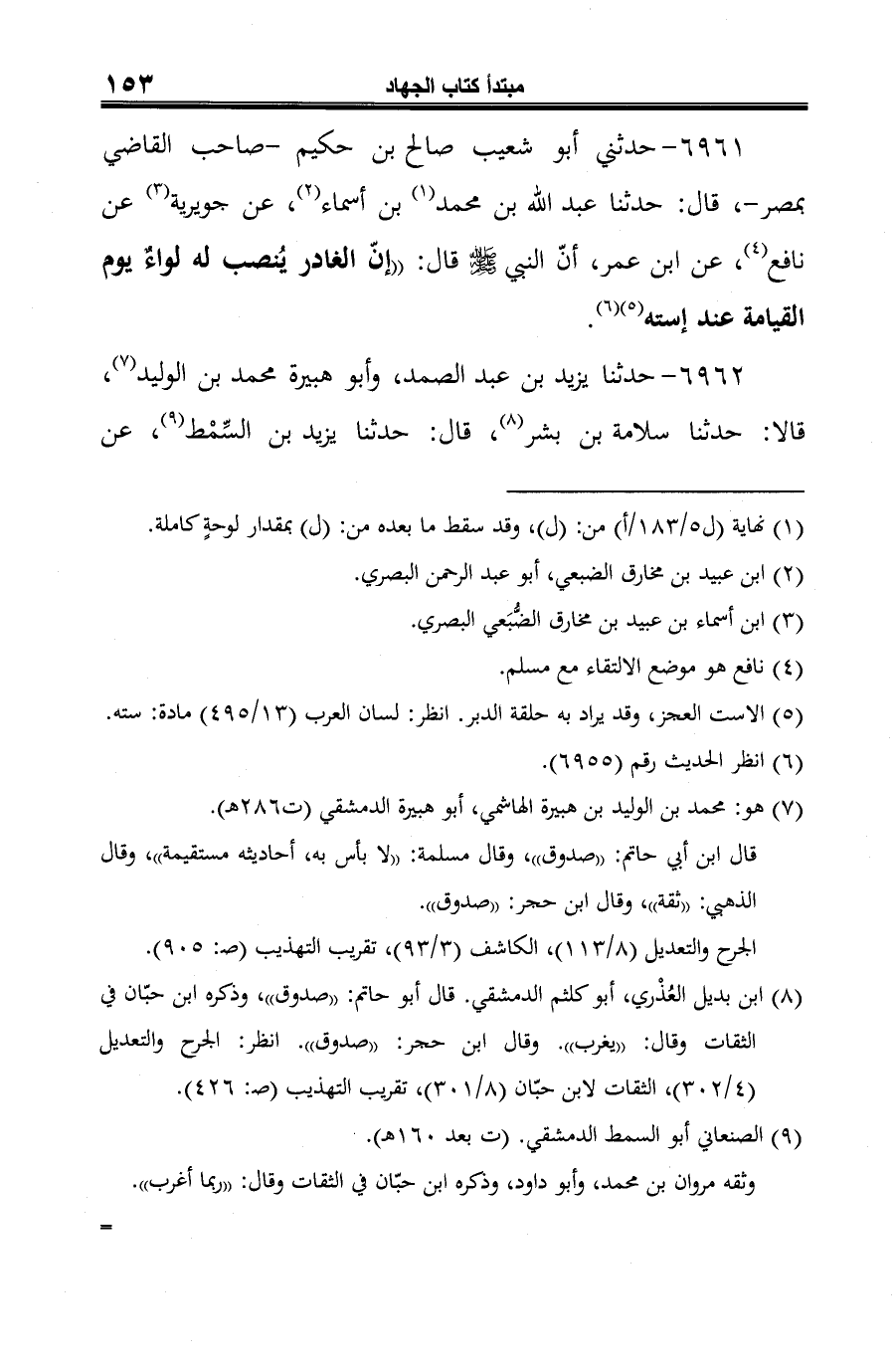 6961 - حدثني أبو شعيب صالح بن حكيم -صاحب القاضي بمصر-، قال: حدثنا عبد الله بن محمد (¬1) بن أسماء (¬2)، عن جويرية (¬3) عن نافع (¬4)، عن ابن عمر، أنّ النبي -صلى الله عليه وسلم- قال: "إنّ الغادر يُنصب له لواءٌ يوم القيامة عند إسته (¬5) (¬6).