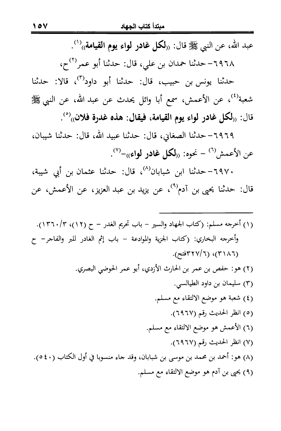 6969 - حدّثنا الصغاني، قال: حدّثنا عبيد الله، قال: حدّثنا شيبان، عن الأعمش (¬1) -نحوه: "لكل غادر لواء"- (¬2).