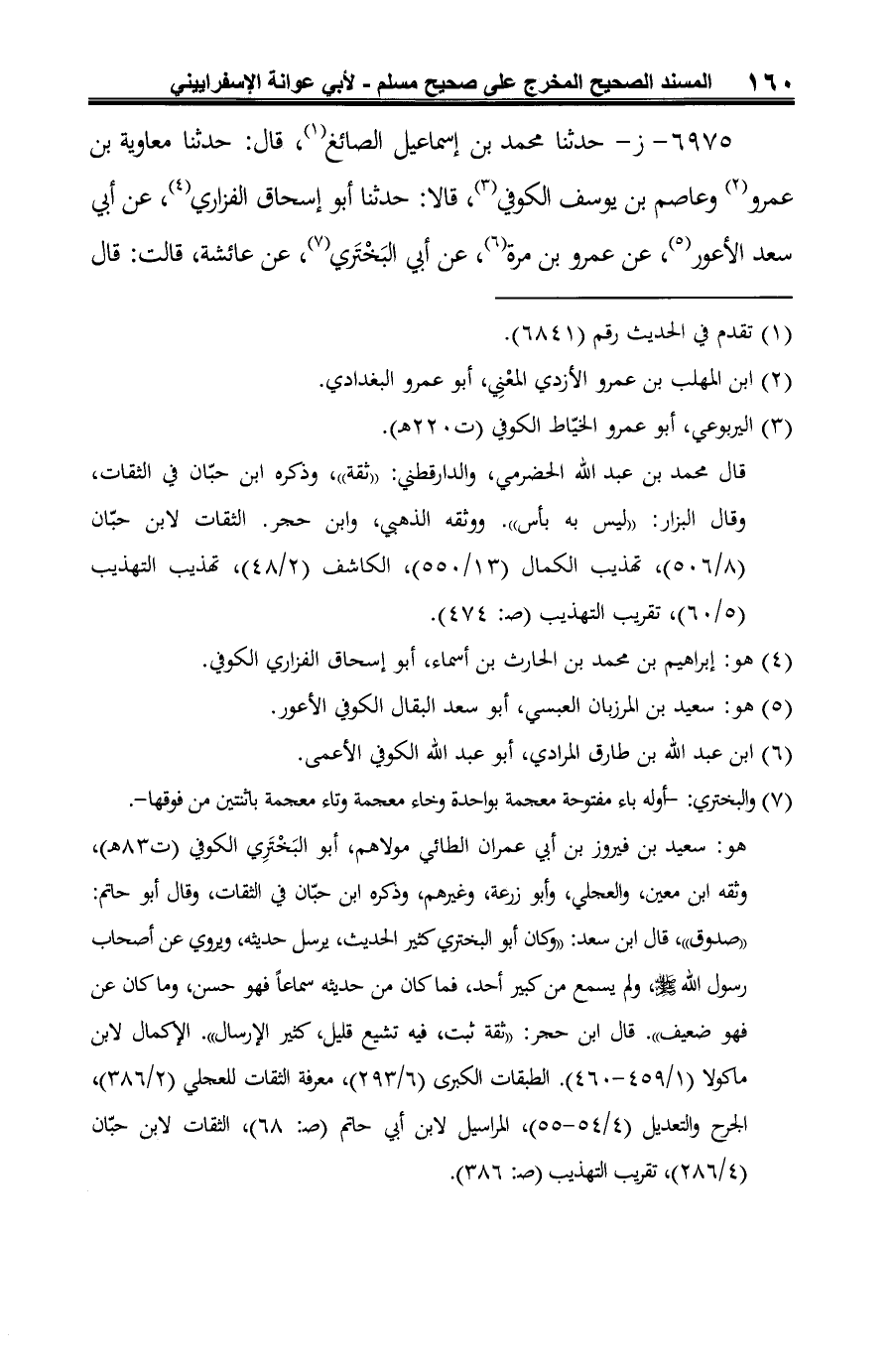 6975 - ز- حدّثنا محمّد بن إسماعيل الصائغ (¬1)، قال: حدّثنا معاوية بن عمرو (¬2) وعاصم بن يوسف الكوفي (¬3)، قالا: حدّثنا أبو إسحاق الفزاري (¬4)، عن أبي سعد الأعور (¬5)، عن عمرو بن مرّة (¬6)، عن أبي البَخْتَري (¬7)، عن عائشة، قالت: قال