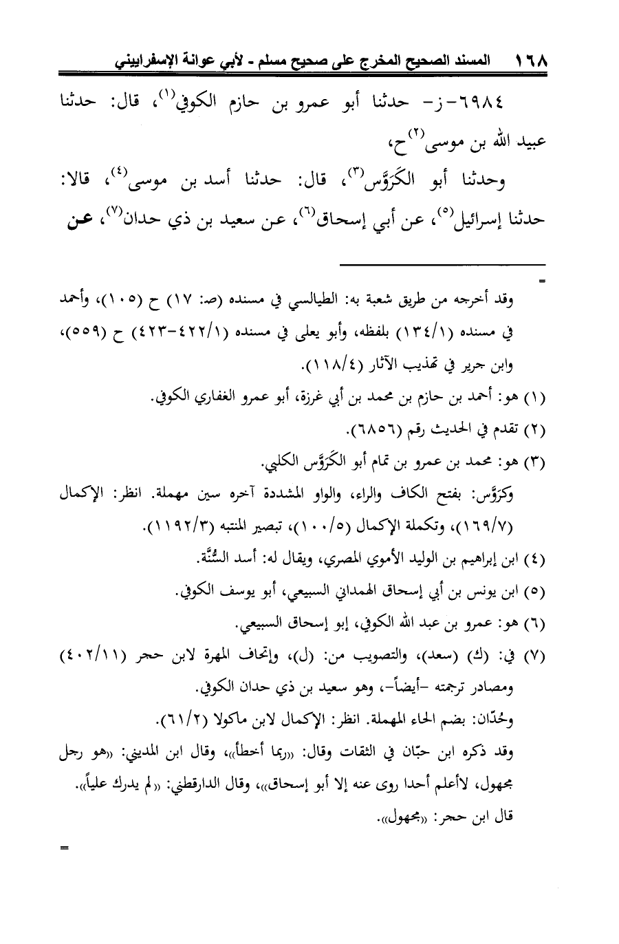 6984 - ز- حدّثنا أبو عمرو بن حازم الكوفي (¬1)، قال: حدّثنا عبيد الله بن موسى (¬2) ح.