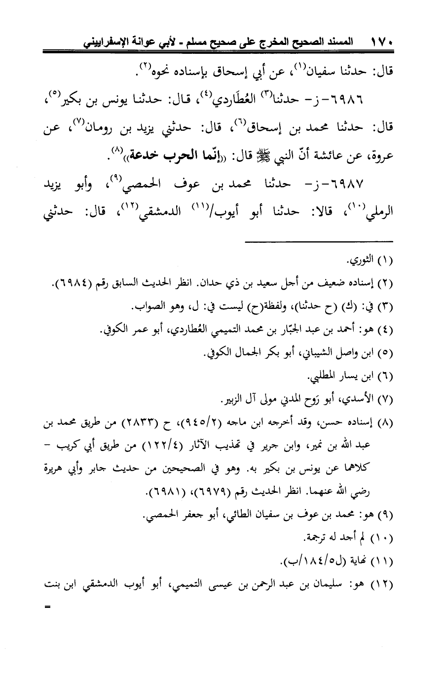 6986 - ز- حدّثنا (¬1) العُطَاردي (¬2)، قال: حدّثنا يونس بن بكير (¬3)، قال: حدّثنا محمّد بن إسحاق (¬4)، قال: حدثني يزيد بن رومان (¬5)، عن عروة، عن عائشة أن النبي -صلى الله عليه وسلم- قال: "إنّما الحرب خدعة" (¬6).