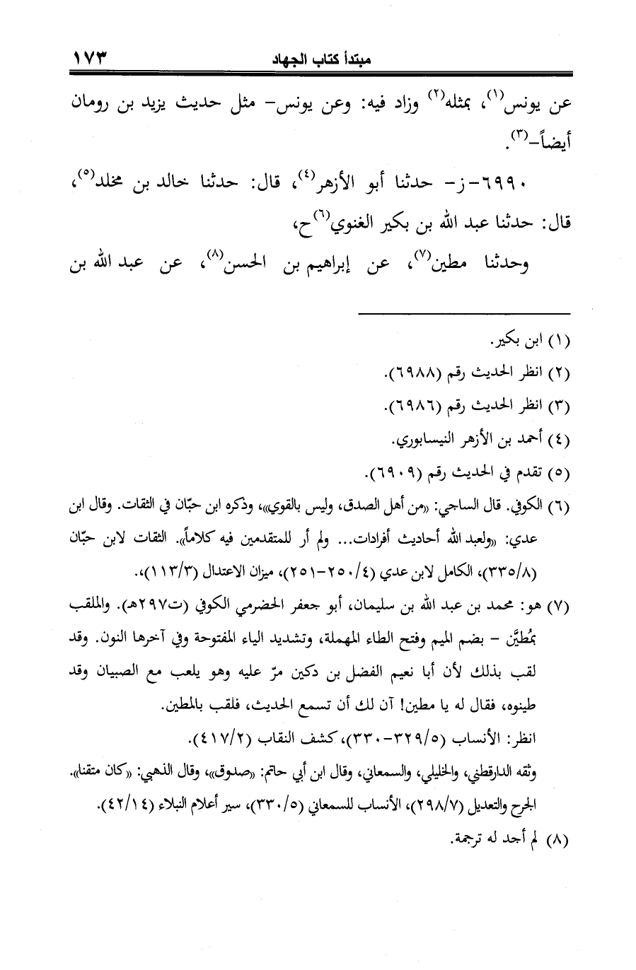 (¬4) هو: محمّد بن عبد الله بن سليمان، أبو جعفر الحضرمي الكوفي (ت 297 ص). والملقب بمُطيَّن -بضم الميم وفتح الطاء المهملة، وتشديد الياء المفتوحة وفي آخرها النون. وقد لقب بذلك لأن أبا نعيم الفضل بن دكين مرّ عليه وهو يلعب مع الصبيان وقد طينوه، فقال له يا مطين! آن لك أن تسمع الحديث، فلقب بالمطين.