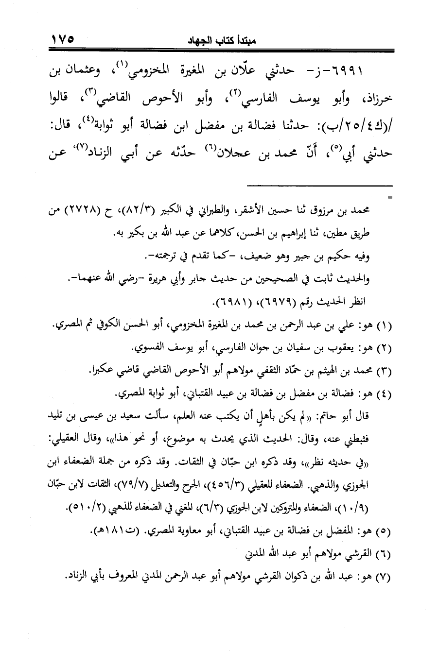6991 - ز- حدثني علّان بن المغيرة المخزومي (¬1)، وعثمان بن خرزاذ، وأبو يوسف الفارسي (¬2)، وأبو الأحوص القاضي (¬3)، قالوا: حدّثنا فضالة بن مفضل ابن فضالة أبو ثوابة (¬4)، قال: حدثني أبي (¬5)، أَنّ محمّد بن عجلان (¬6) حدّثه عن أبي الزِّناد (¬7)، عن