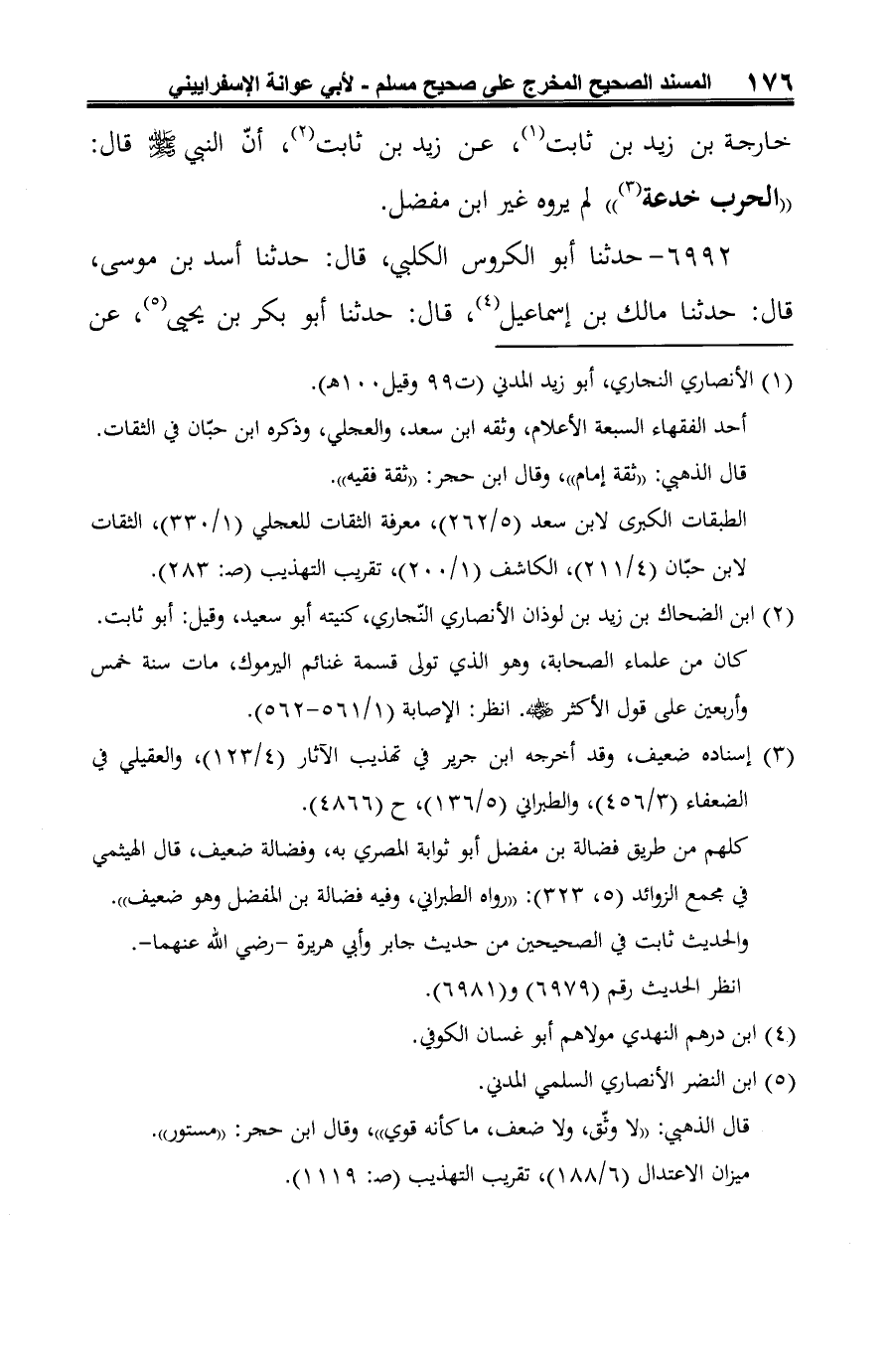 -[177]- أبيه (¬3)، عن أبي هريرة (¬4) قال: قال أبو القاسم -صلى الله عليه وسلم-: "الحرب خدعة" (¬5).