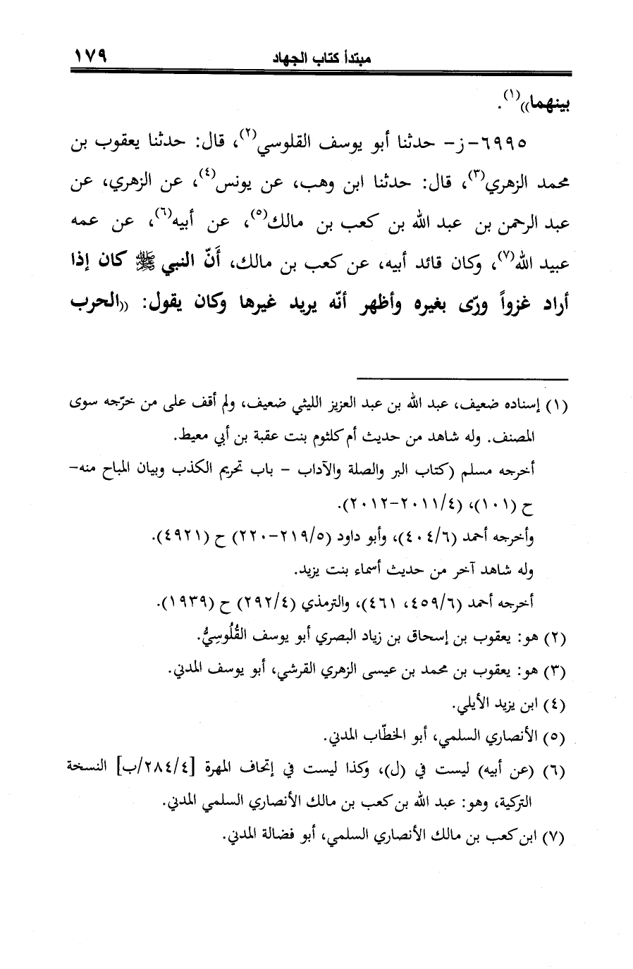 6995 - ز - حدّثنا أبو يوسف القلوسي (¬1)، قال: حدّثنا يعقوب بن محمّد الزّهريُّ (¬2)، قال: حدّثنا ابن وهب، عن يونس (¬3)، عن الزّهريّ، عن عبد الرّحمن بن عبد الله بن كعب بن مالك (¬4)، عن أبيه (¬5)، عن عمه عبيد الله (¬6)، وكان قائد أبيه، عن كعب بن مالك، أَنّ النبي -صلى الله عليه وسلم- كان إذا أراد غزوًا ورّى بغيره وأظهر أنّه يريد غيرها وكان يقول: "الحرب