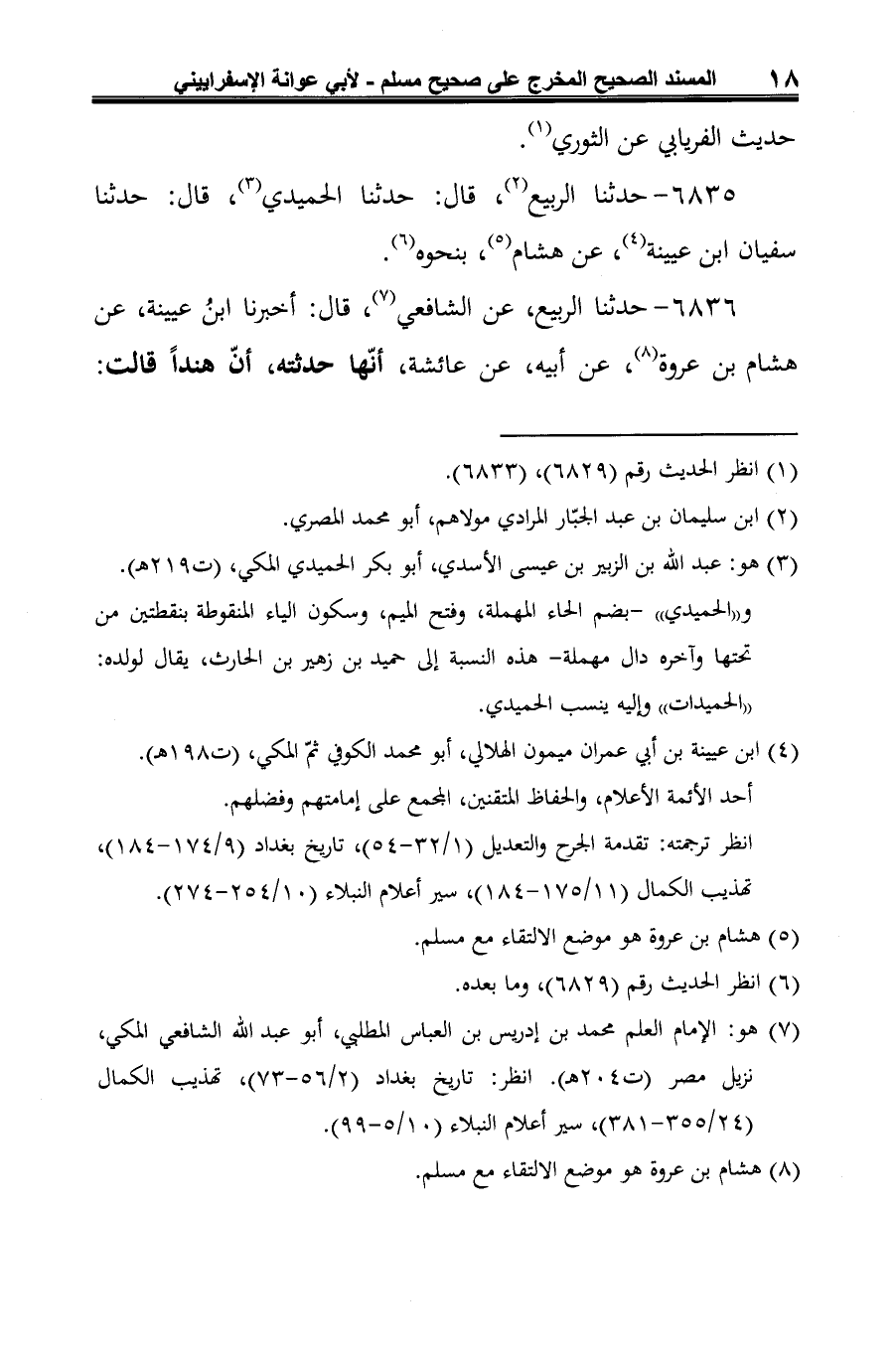 6835 - حدثنا الربيع (¬1)، قال: حدثنا الحميدي (¬2)، قال: حدثنا سفيان ابن عيينة (¬3)، عن هشام (¬4)، بنحوه (¬5).