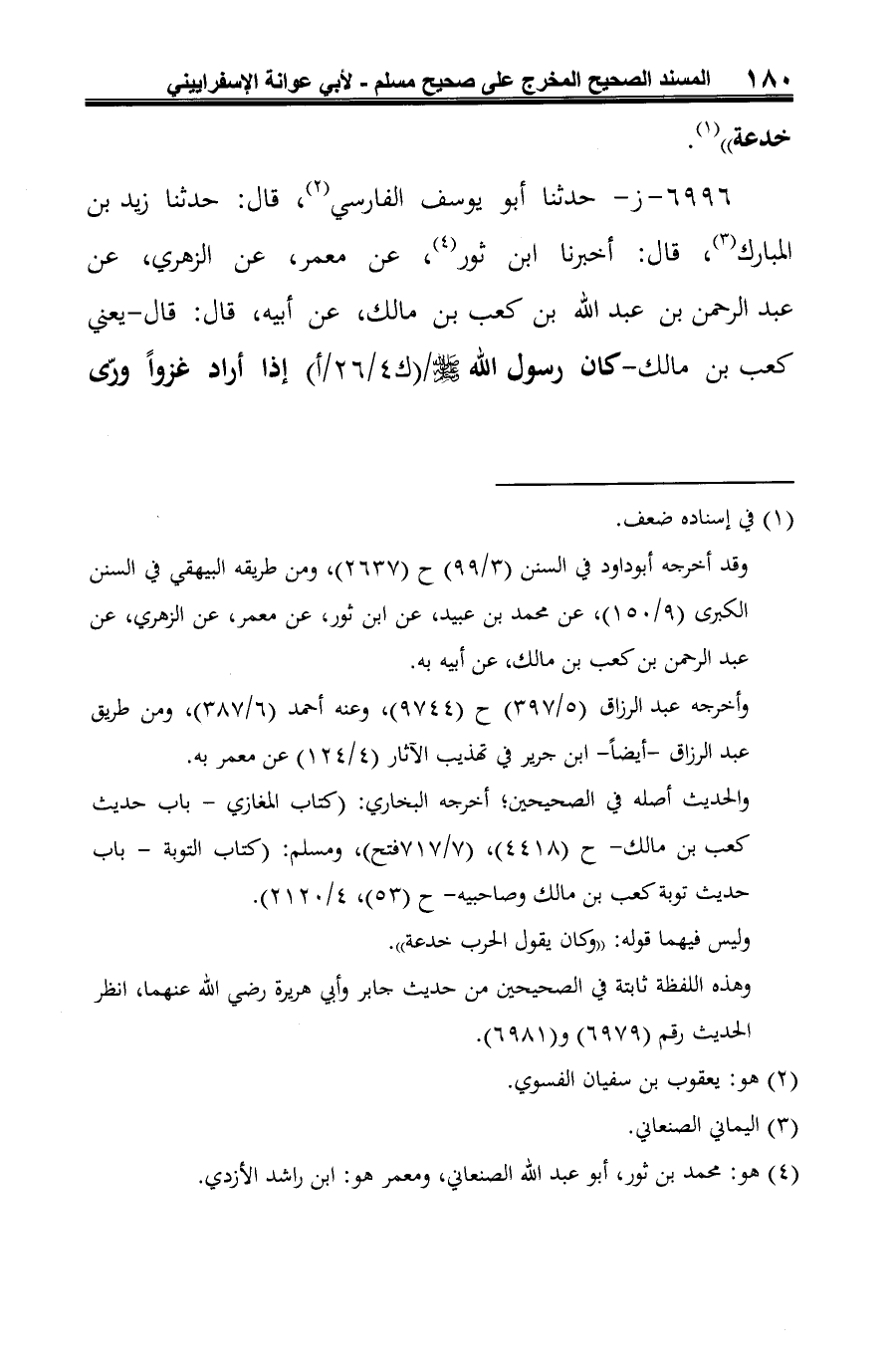 6996 - ز- حدّثنا أبو يوسف الفارسي (¬1)، قال: حدّثنا زيد بن المبارك (¬2)، قال: أخبرنا ابن ثور (¬3)، عن معمر، عن الزّهريّ، عن عبد الرّحمن بن عبد الله بن كعب بن مالك، عن أبيه، قال: قال -يعني كعب بن مالك- كان رسول الله -صلى الله عليه وسلم- إذا أراد غزوًا ورّى