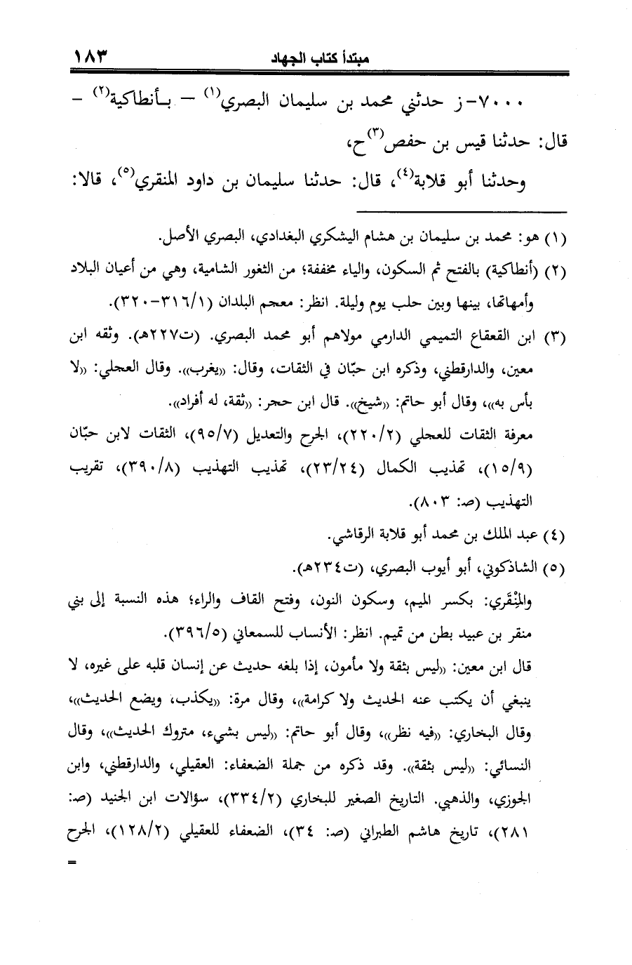 7000 - ز - حدثني محمّد بن سليمان البصري (¬1) -بأنطاكية (¬2) - قال: حدّثنا قيس بن حفص (¬3) ح،
