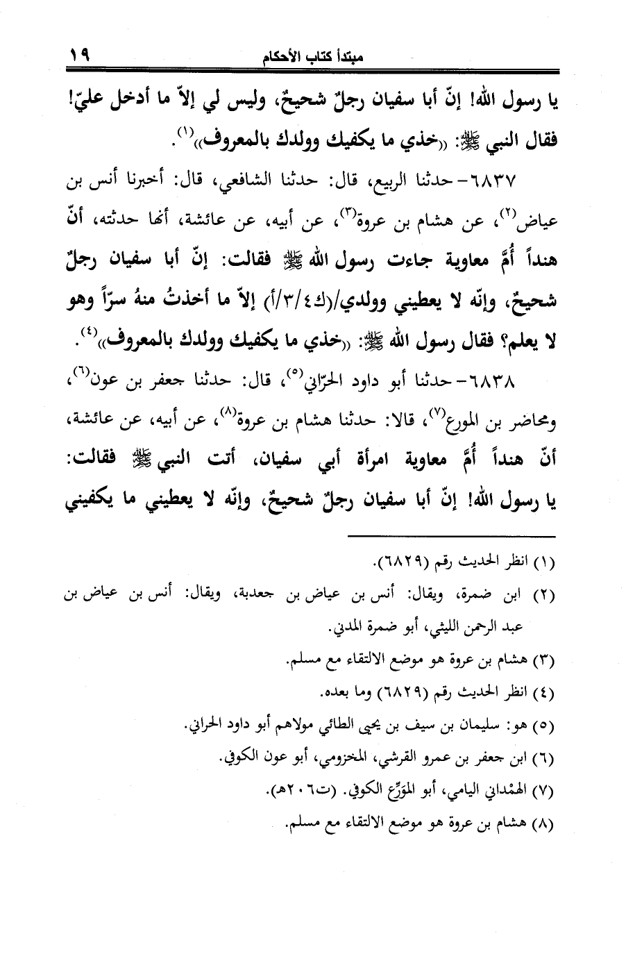 6837 - حدثنا الربيع، قال: حدثنا الشافعي، قال: أخبرنا أنس بن عياض (¬1)، عن هشام بن عروة (¬2)، عن أبيه، عن عائشة، أنها حدثته، أنّ هندًا أُمَّ معاوية جاءت رسول الله -صلى الله عليه وسلم- فقالت: إنّ أبا سفيان رجلٌ شحيحٌ، وإنّه لا يعطيني وولدي إلّا ما أخذتُ منهُ سرًّا وهو لا يعلم؟ فقال رسول الله -صلى الله عليه وسلم-: "خذي ما يكفيك وولدك بالمعروف" (¬3).