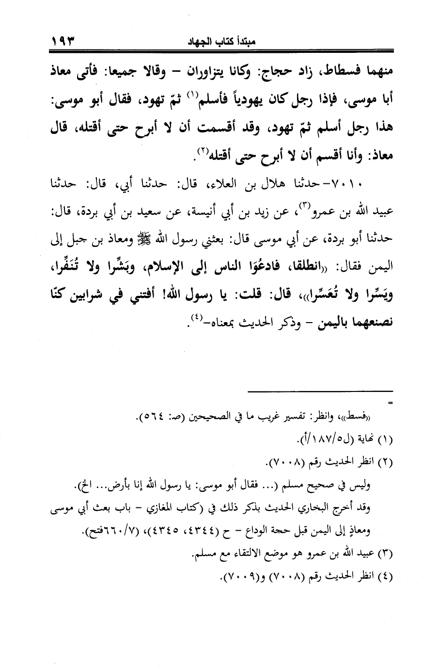 7010 - حدّثنا هلال بن العلاء، قال: حدّثنا أبي، قال: حدّثنا عبيد الله بن عمرو (¬1)، عن زيد بن أبي أنيسة، عن سعيد بن أبي بردة، قال: حدّثنا أبو بردة، عن أبي موسى قال: بعثني رسول الله -صلى الله عليه وسلم- ومعاذ بن جبل إلى اليمن فقال: "انطلقا، فادعُوَا النَّاس إلى الإسلام، وبَشِّرا ولا تُنَفِّرا، ويَسِّرا ولا تُعَسِّرا"، قال: قلت: يا رسول الله! أفتني في شرابين كنَّا نصنعهما باليمن -وذكر الحديث بمعناه- (¬2).