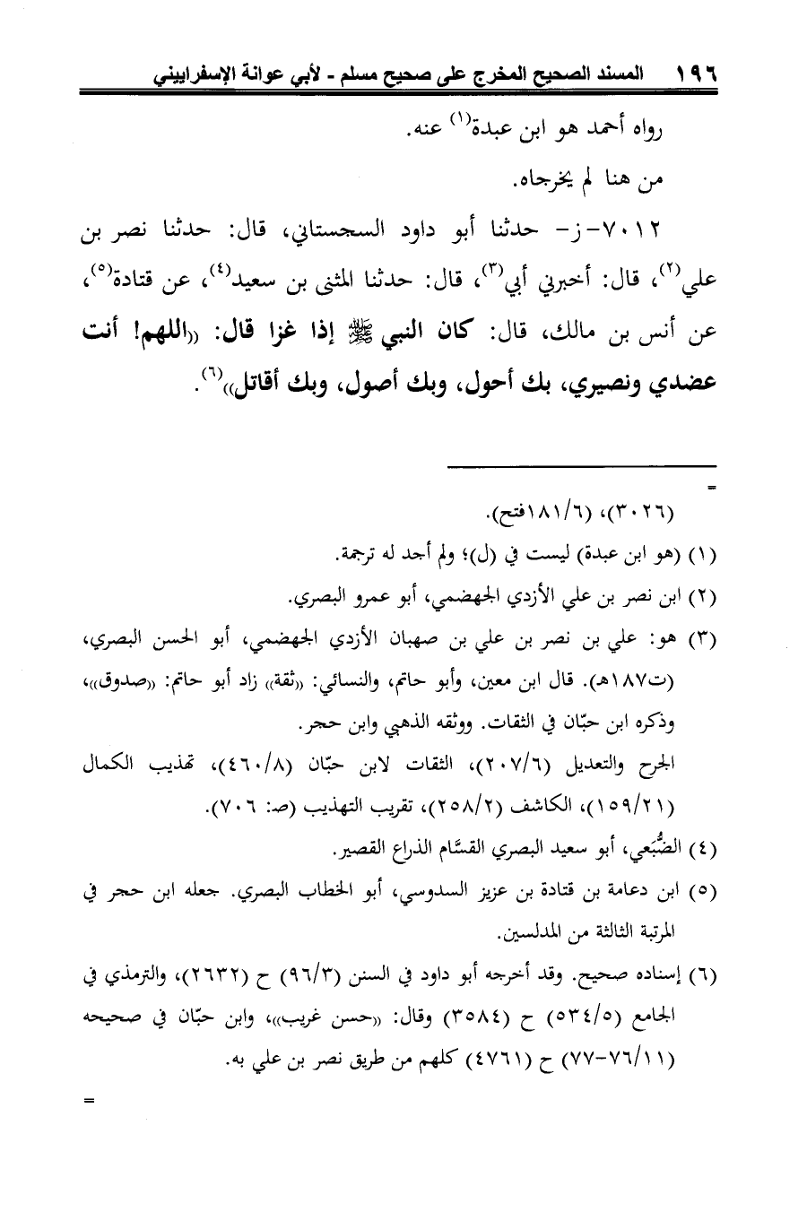 7012 - ز - حدّثنا أبو داود السجستاني، قال: حدّثنا نصر بن علي (¬1)، قال: أخبرني أبي (¬2)، قال: حدّثنا المثنى بن سعيد (¬3)، عن قتادة (¬4)، عن أنس بن مالك، قال: كان النّبيّ -صلى الله عليه وسلم- إذا غزا قال: "اللَّهُمَّ! أنت عضدي ونصيري، بك أحول، وبك أصول، وبك أقاتل" (¬5).