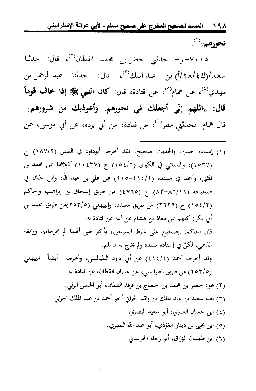 7015 - ز - حدثني جعفر بن محمّد القطان (¬1)، قال: حدّثنا سعيد بن عبد الملك (¬2)، قال: حدّثنا عبد الرّحمن بن مهدي (¬3)، عن همام (¬4)، عن قتادة، قال: كان النّبيّ -صلى الله عليه وسلم- إذا خاف قومًا قال: "اللَّهُمَّ إنّي أجعلك في نحورهم، وأعوذ بك من شرورهم".