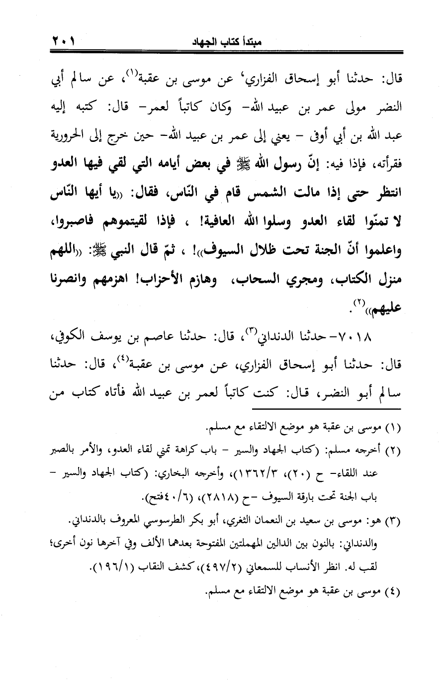 7018 - حدّثنا الدنداني (¬1)، قال: حدّثنا عاصم بن يوسف الكوفي، قال: حدّثنا أبو إسحاق الفزاري، عن موسى بن عقبة (¬2)، قال: حدّثنا سالم أبو النضر، قال: كنت كاتبًا لعمر بن عبيد الله فأتاه كتاب من