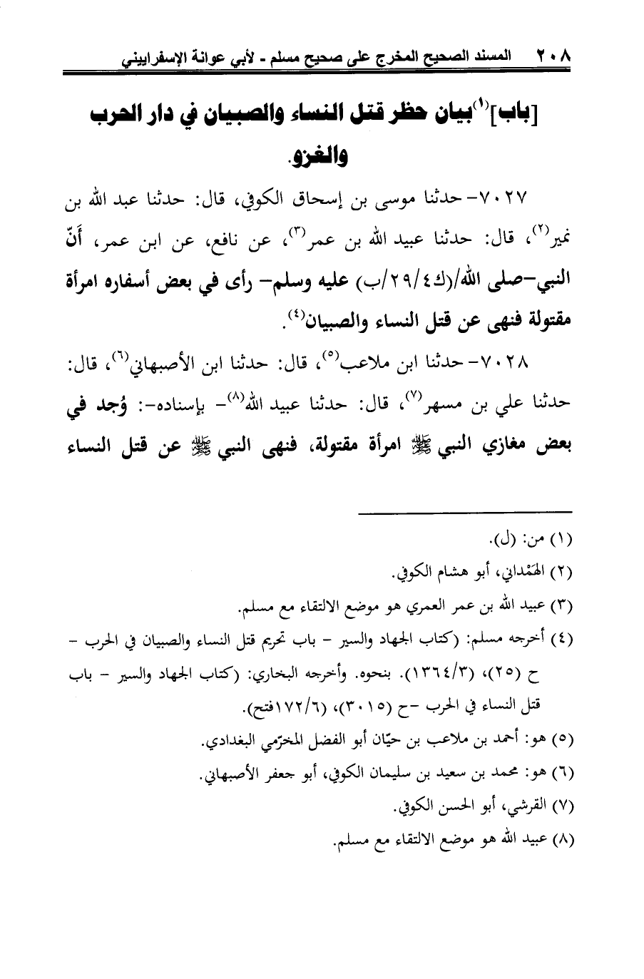 7027 - حدثنا موسى بن إسحاق الكوفي، قال: حدثنا عبد الله بن نمير (¬1)، قال: حدثنا عبيد الله بن عمر (¬2)، عن نافع، عن ابن عمر، أَنّ النبي -صلى الله عليه وسلم - رأى في بعض أسفاره امرأة مقتولة فنهى عن قتل النساء والصبيان (¬3).