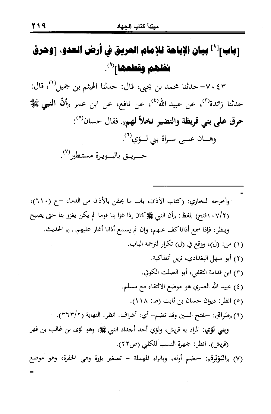 7043 - حدثنا محمد بن يحيى، قال: حدثنا الهيثم بن جميل (¬1)، قال: حدثنا زائدة (¬2)، عن عبيد الله (¬3)، عن نافع، عن ابن عمر "أنّ النبي صلى الله عليه وسلم حرق علي بني قريظة والنضير نخلًا لهم". فقال حسان (¬4):
