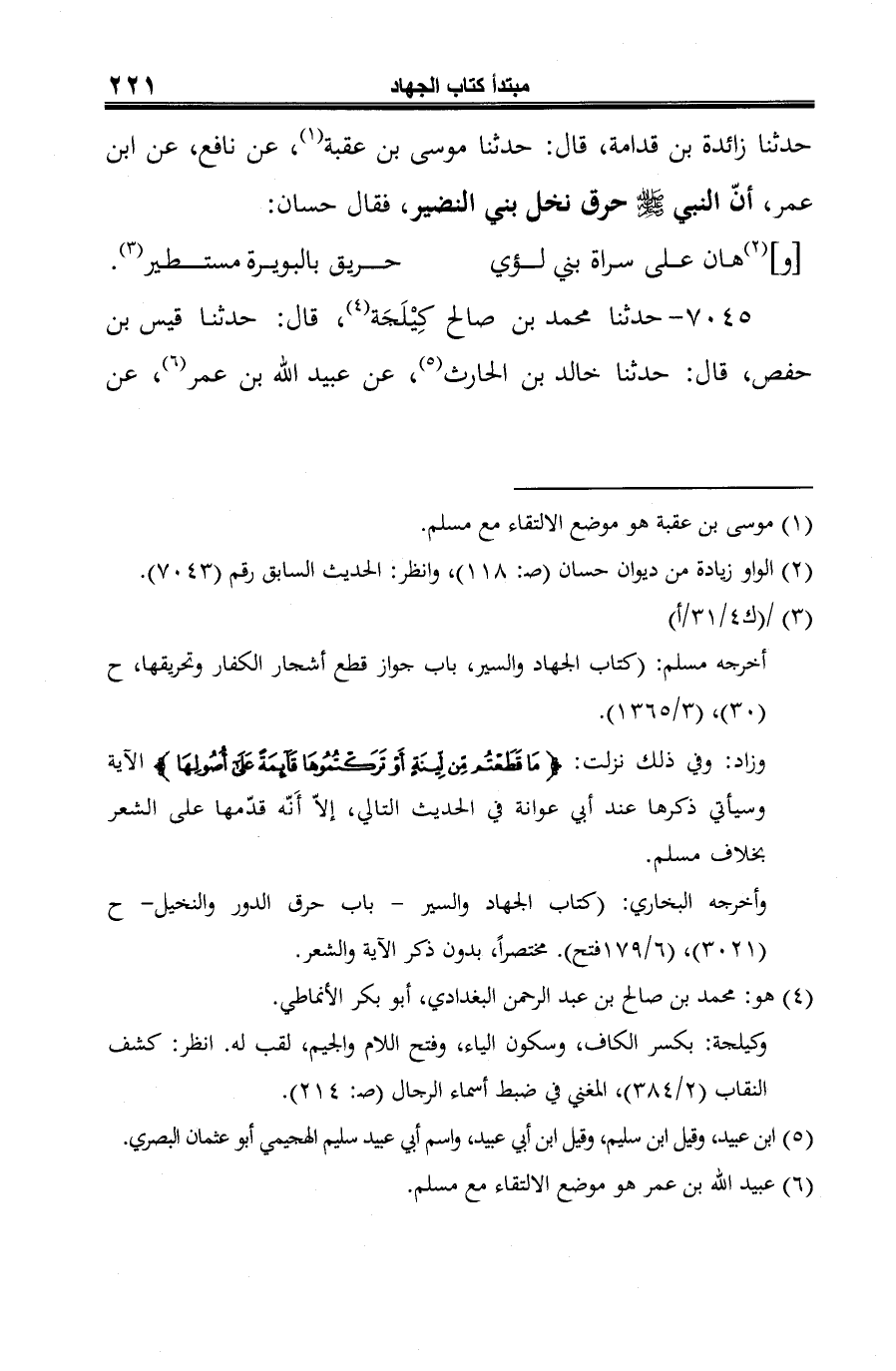 -[222]- نافع، عن ابن عمر، قال: "حرق رسول الله -صلى الله عليه وسلم- نخل بني النضير" (¬4).