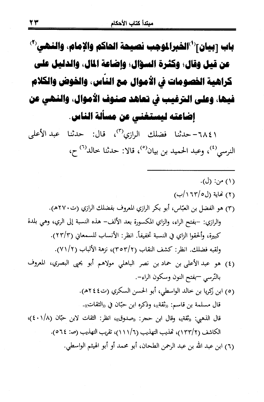 باب [بيان] (¬1) الخبر الموجب نصيحة الحاكم والإمام، والنهي (¬2) عن قيل وقال؛ وكثرة السؤال؛ وإضاعة المال، والدليل على كراهية الخصومات في الأموال مع النّاس، والخوض والكلام فيها، وعلى الترغيب في تعاهد صنوف الأموال، والنهي عن إضاعته ليستغني عن مسألة الناس