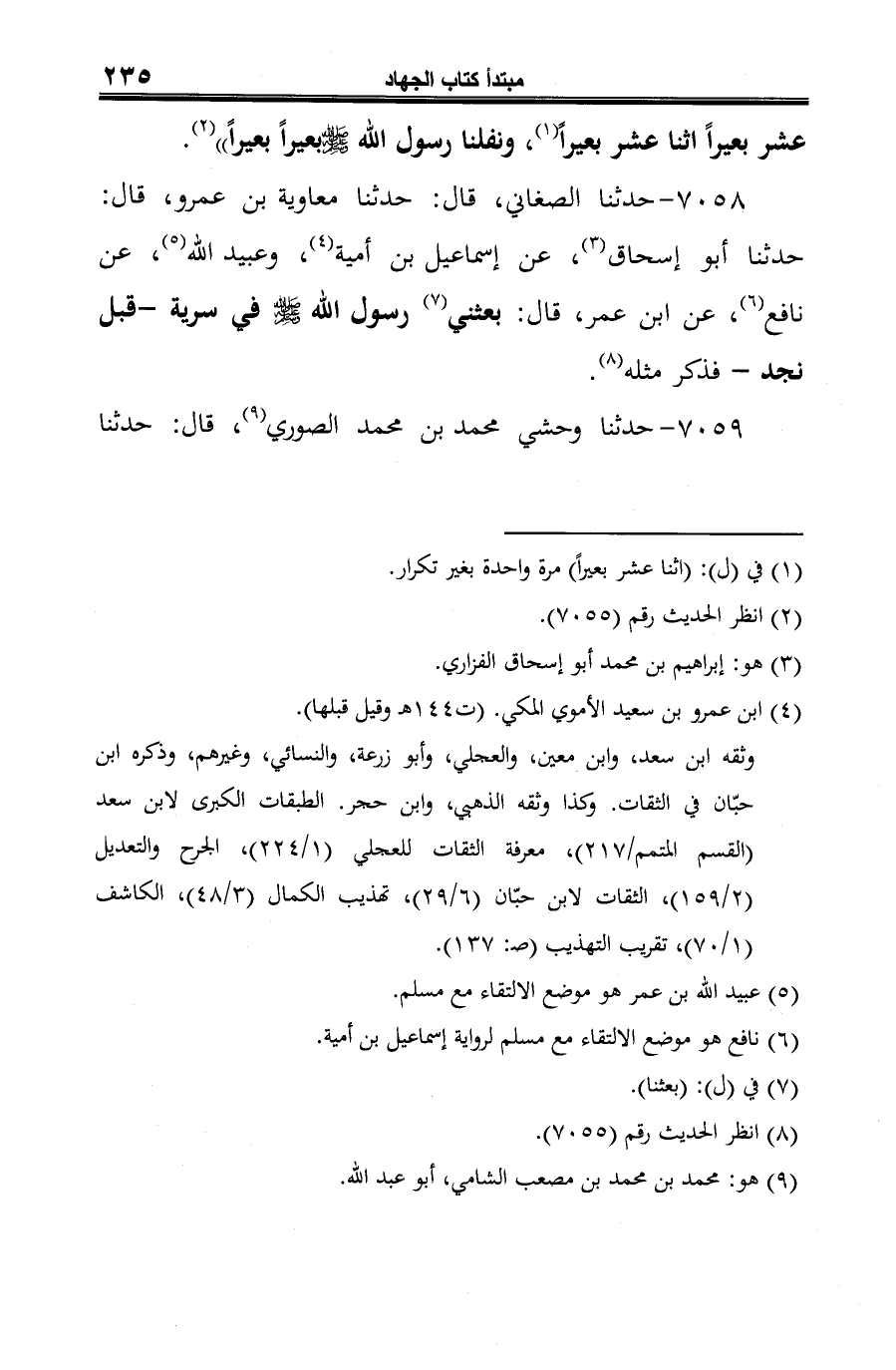 7058 - حدثنا الصغاني، قال: حدثنا معاوية بن عمرو، قال: حدثنا أبو إسحاق (¬1)، عن إسماعيل بن أمية (¬2)، وعبيد الله (¬3)، عن نافع (¬4)، عن ابن عمر، قال: بعثني (¬5) رسول الله صلى الله عليه وسلم في سرية -قبل نجد- فذكر مثله (¬6).