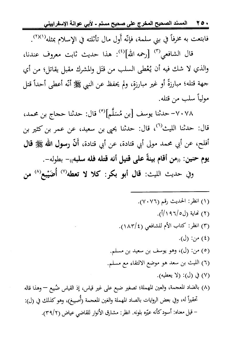 7078 - حدثنا يوسف [بن مُسَلَّم] (¬1) قال: حدثنا حجاج بن محمد، قال: حدثنا الليث (¬2)، قال: حدثنا يحيى بن سعيد، عن عمر بن كثير بن أفلح، عن أبي محمد مولى أبي قتادة، عن أبي قتادة، أَنّ رسول الله صلى الله عليه وسلم قال يوم حنين: "من أقام بينةً على قتيل أنه قتله فله سلبه" -بطوله-.