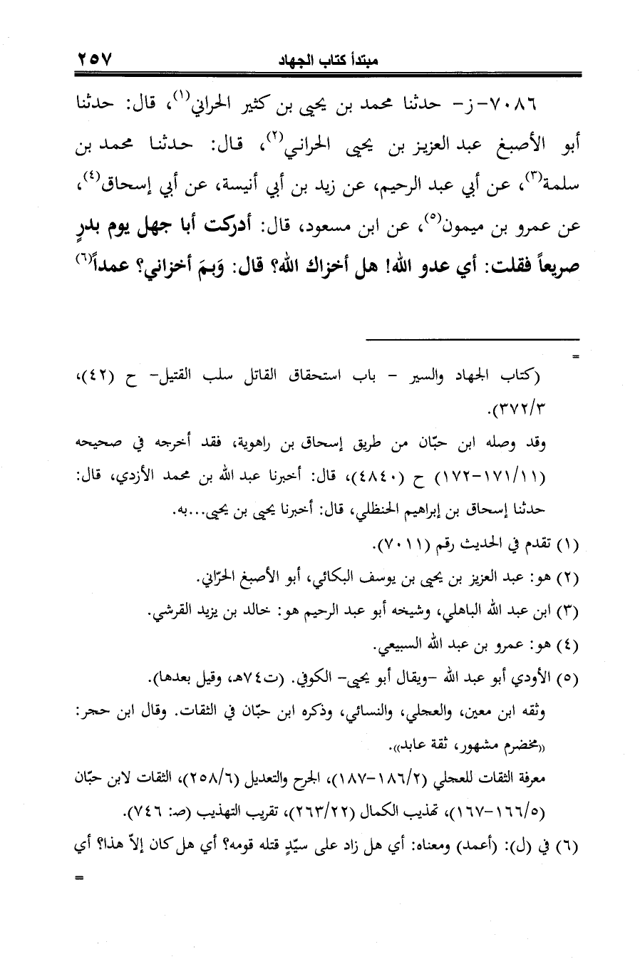 7086 - ز- حدثنا محمد بن يحيى بن كثير الحراني (¬1)، قال: حدثنا أبو الأصبغ عبد العزيز بن يحيى الحراني (¬2)، قال: حدثنا محمد بن سلمة (¬3)، عن أبي عبد الرحيم، عن زيد بن أبي أنيسة، عن أبي إسحاق (¬4)، عن عمرو بن ميمون (¬5)، عن ابن مسعود، قال: أدركت أبا جهل يوم بدرٍ صريعًا فقلت: أي عدو الله! هل أخزاك الله؟ قال: وَبمَ أخزاني؟ عمدًا (¬6)