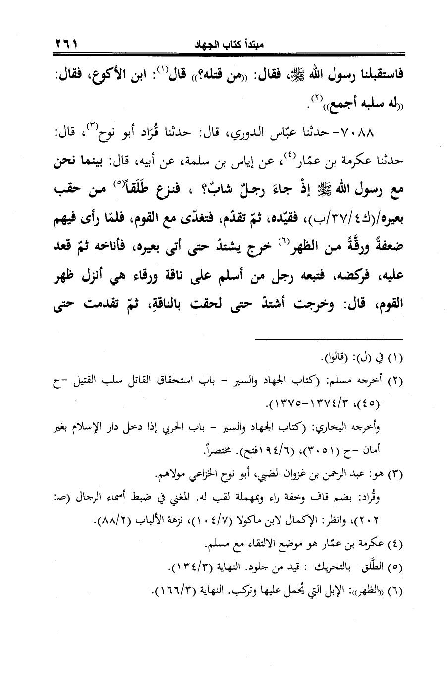 -[262]- أخذت بخطام البعيرِ، ثمّ أنخته، فلمّا وضع ركبتيه في الأرض اخترطت (¬5) سيفي، فضربته فندر رأسه، ثمّ جئت بالجمل ورحله وأداته وسيفه أقوده، فاستقبلني النبي -صلى الله عليه وسلم-، فقال: "من قتل الرجل؟ " قالوا: ابن الأكوع. قال: "له سلبه أجمع" (¬6).