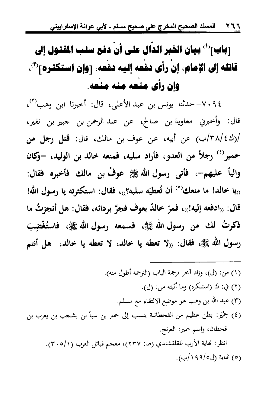 (¬5) أخرجه مسلم: (كتاب الجهاد والسير -باب استحقاق القاتل سلب المقتول- ح (43)، 3/ 1373).