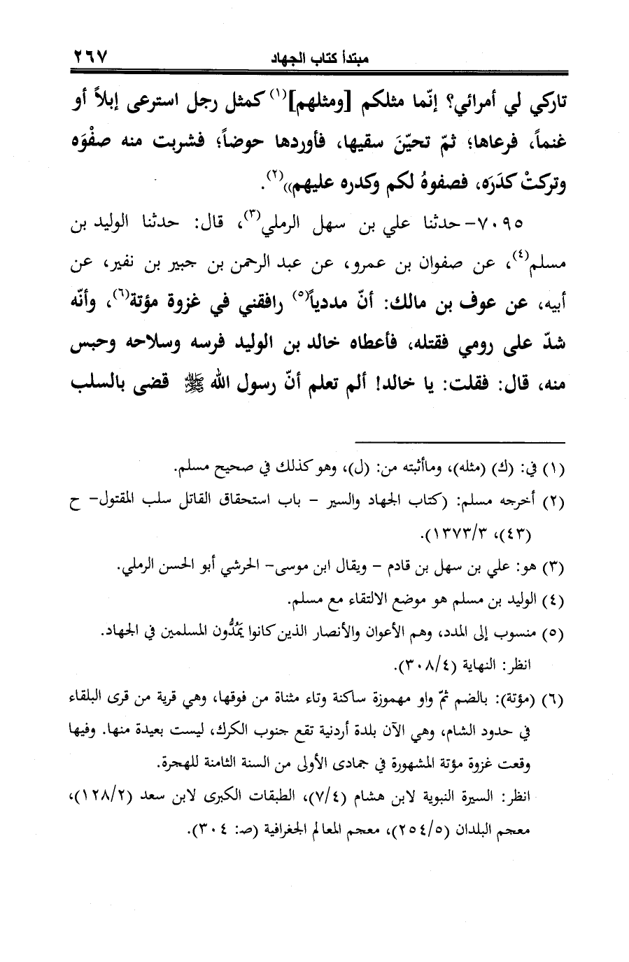 (¬5) أخرجه مسلم: (كتاب الجهاد والسير -باب استحقاق القاتل سلب القتيل- ح (44)، 3/ 1374). وزاد: "بلى ولكنّي استكثرته".