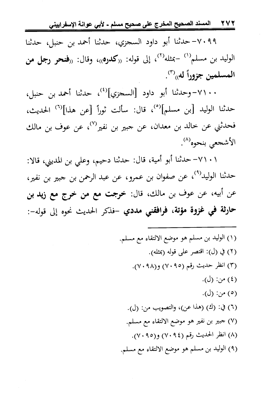 7101 - حدثنا أبو أمية، قال: حدثنا دحيم، وعلي بن المديني، قالا: حدثنا الوليد (¬1)، عن صفوان بن عمرو، عن عبد الرحمن بن جبير بن نفير، عن أبيه، عن عوف بن مالك، قال: خرجت مع من خرج مع زيد بن حارثة في غزوة مؤتة، فرافقني مددي -فذكر الحديث نحوه إلى قوله-: