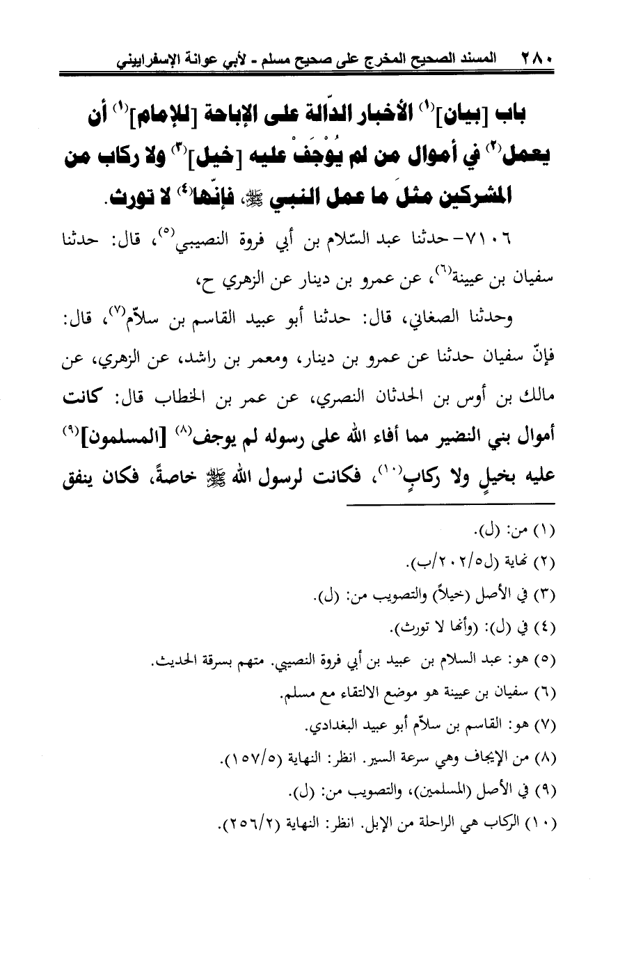(¬8) أخرجه مسلم: (كتاب الجهاد والسير -باب حكم الفيء- ح (48)، 3/ 1376 - 1377)، وأخرجه البخاري: (كتاب التفسير -باب قوله {وَمَا أَفَاءَ اللَّهُ عَلَى رَسُولِهِ} - ح (4885)، (8/ 498 فتح).