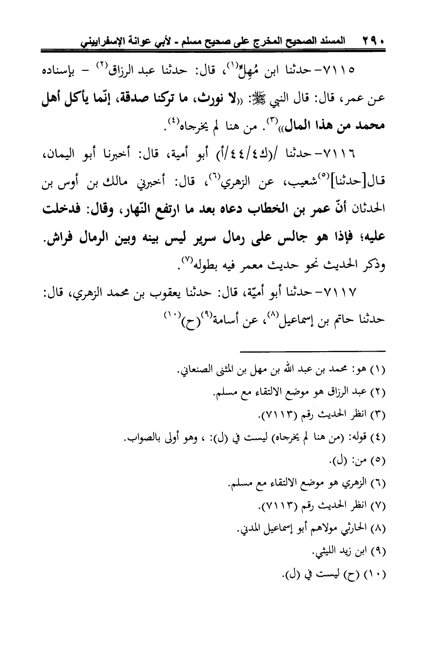 7115 - حدثنا ابن مُهِلٍّ (¬1)، قال: حدثنا عبد الرزاق (¬2) -بإسناده عن عمر، قال: قال النبي -صلى الله عليه وسلم-: "لا نورث، ما تركنا صدقة، إنّما يأكل أهل محمد من هذا المال" (¬3). من هنا لم يخرجاه (¬4).