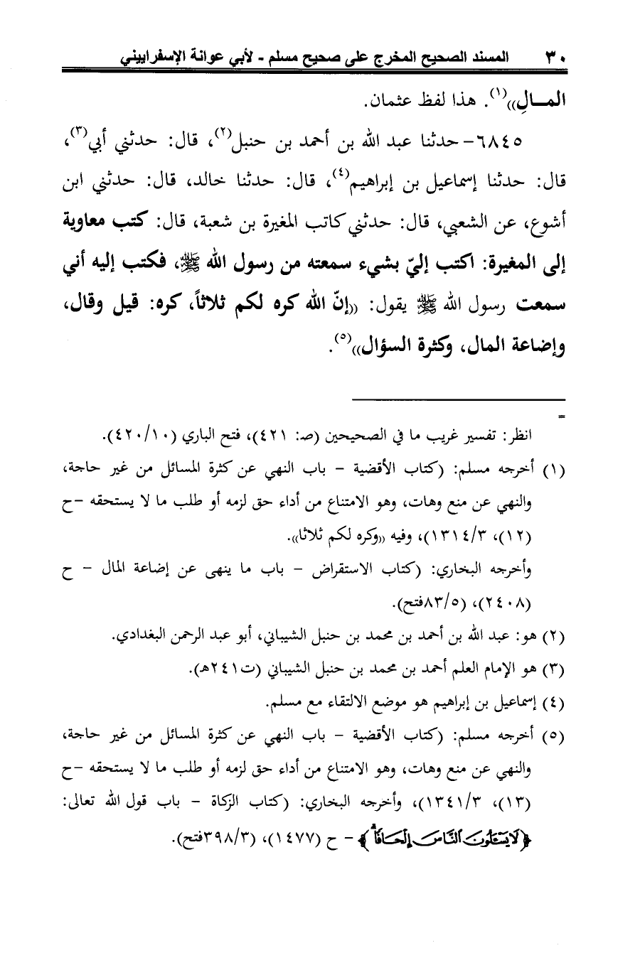 6845 - حدثنا عبد الله بن أحمد بن حنبل (¬1)، قال: حدثني أبي (¬2)، قال: حدثنا إسماعيل بن إبراهيم (¬3)، قال: حدثنا خالد، قال: حدثني ابن أشوع، عن الشعبي، قال: حدثني كاتب المغيرة بن شعبة، قال: كتب معاوية إلى المغيرة: اكتب إليّ بشيء سمعته من رسول الله -صلى الله عليه وسلم-، فكتب إليه أني سمعت رسول الله -صلى الله عليه وسلم- يقول: "إنّ الله كره لكم ثلاثًا، كره: قيل وقال، وإضاعة المال، وكثرة السؤال" (¬4).