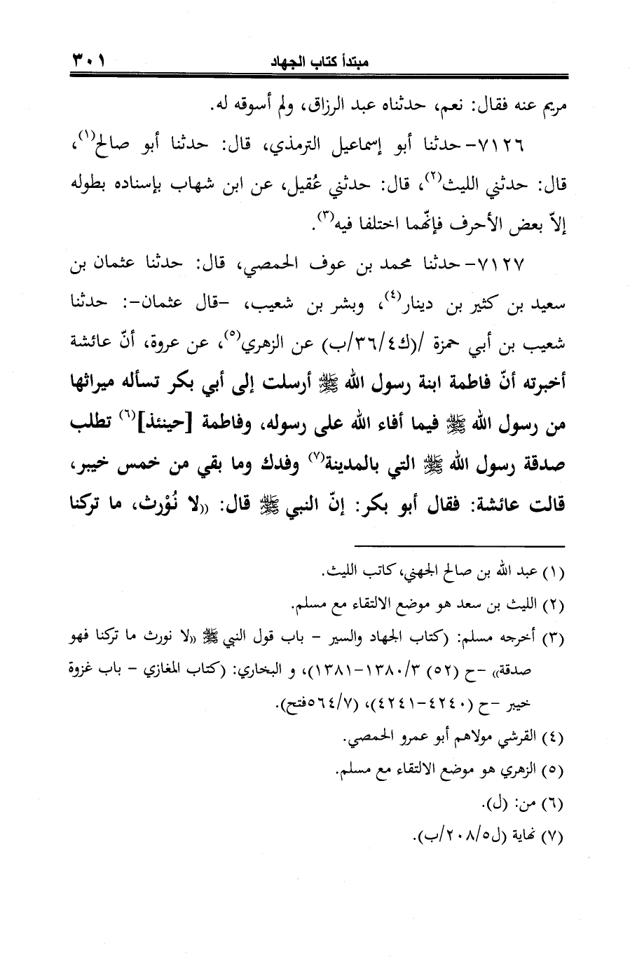 (¬3) أخرجه مسلم: (كتاب الجهاد والسير -باب قول النبي -صلى الله عليه وسلم- "لا نورث ما تركنا فهو صدقة" - ح (52) 3/ 1380 - 1381)، والبخاري: (كتاب المغازي -باب غزوة خيبر- ح (4240 - 4241)، (7/ 564 فتح).