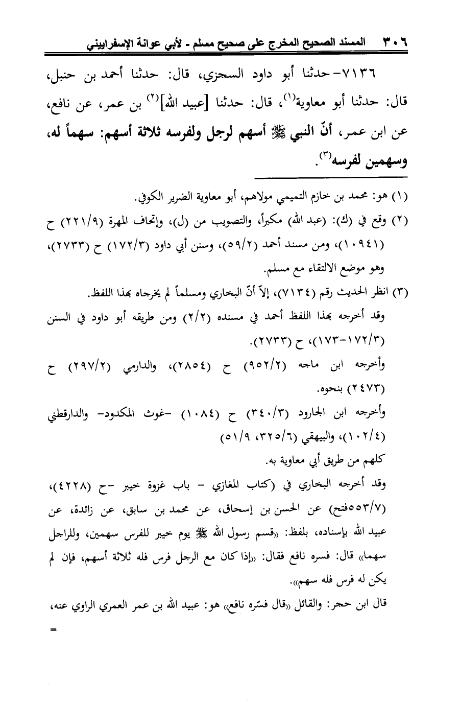 7136 - حدثنا أبو داود السجزي، قال: حدثنا أحمد بن حنبل، قال: حدثنا أبو معاوية (¬1)، قال: حدثنا [عبيد الله] (¬2) بن عمر، عن نافع، عن ابن عمر، أنّ النبي -صلى الله عليه وسلم- أسهم لرجل ولفرسه ثلاثة أسهم: سهمًا له، وسهمين لفرسه (¬3).
