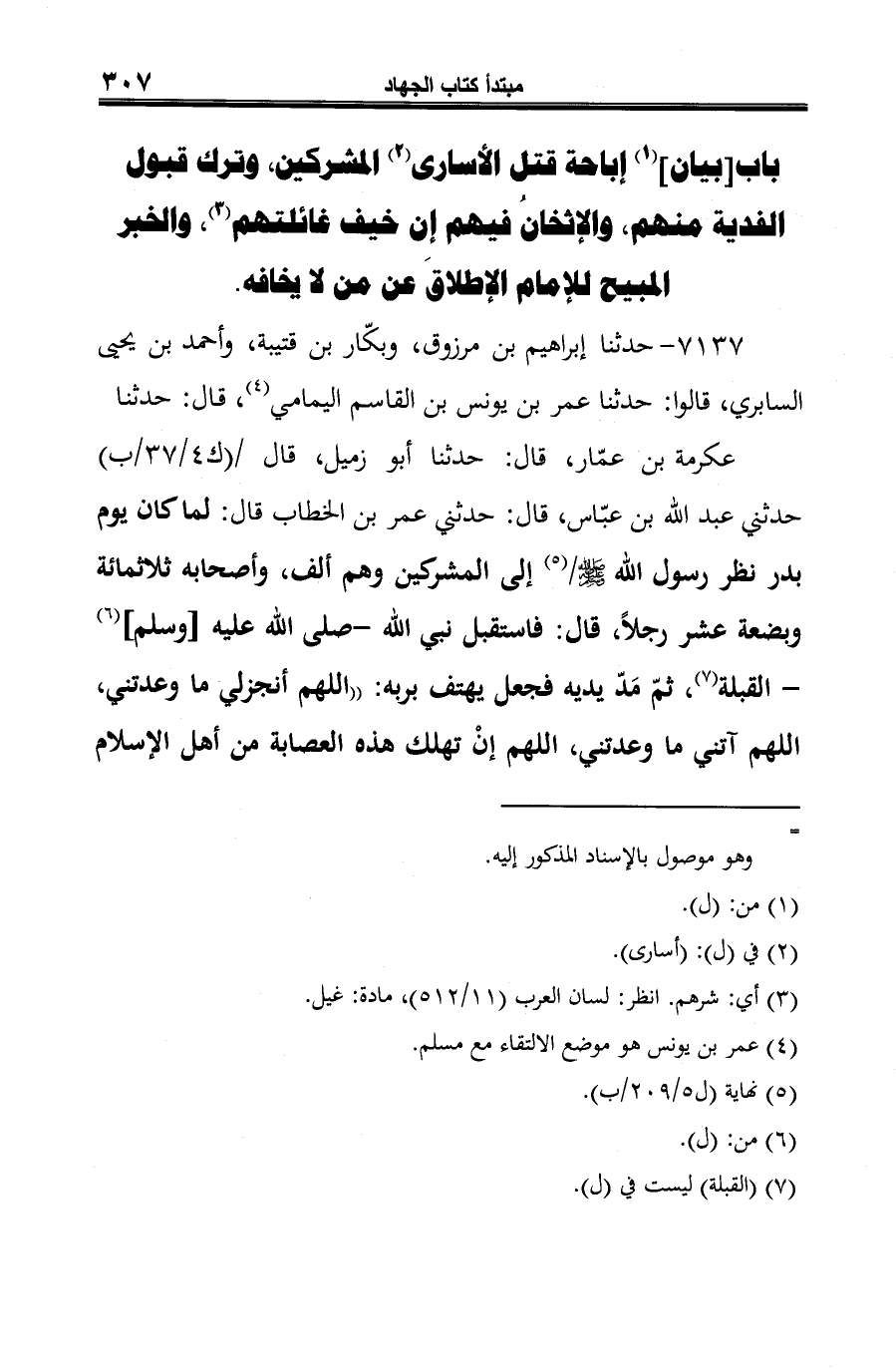 7137 - حدثنا إبراهيم بن مرزوق، وبكّار بن قتيبة، وأحمد بن يحيى السابري، قالوا: حدثنا عمر بن يونس بن القاسم اليمامي (¬1)، قال: حدثنا عكرمة بن عمّار، قال: حدثنا أبو زميل، قال حدثني عبد الله بن عبّاس، قال: حدثني عمر بن الخطاب قال: لما كان يوم بدر نظر رسول الله -صلى الله عليه وسلم- (¬2) إلى المشركين وهم ألف، وأصحابه ثلاثمائة وبضعة عشر رجلًا، قال: فاستقبل نبي الله -صلى الله عليه [وسلم] (¬3) - القبلة (¬4)، ثمّ مَدّ يديه فجعل يهتف بربه: "اللهم أنجز لي ما وعدتني، اللهم آتني ما وعدتني، اللهم إنْ تهلك هذه العصابة من أهل الإسلام