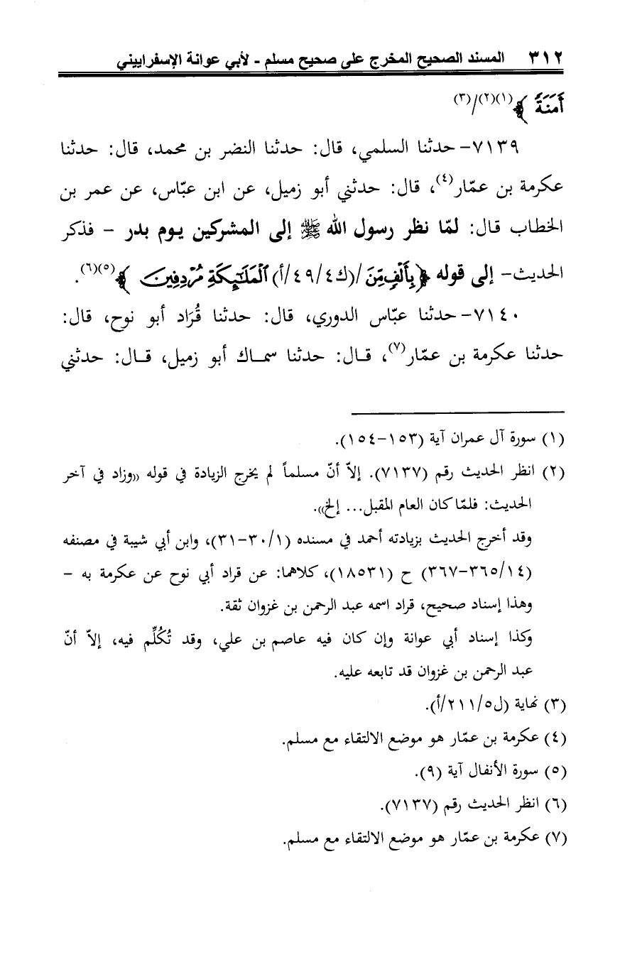 7139 - حدثنا السلمي، قال: حدثنا النضر بن محمد، قال: حدثنا عكرمة بن عمّار (¬1)، قال: حدثني أبو زميل، عن ابن عبّاس، عن عمر بن الخطاب قال: لمّا نظر رسول الله -صلى الله عليه وسلم- إلى المشركين يوم بدر -فذكرَ الحديث- إلى قوله {أَنِّي مُمِدُّكُمْ بِأَلْفٍ مِنَ الْمَلَائِكَةِ مُرْدِفِينَ} (¬2) (¬3).