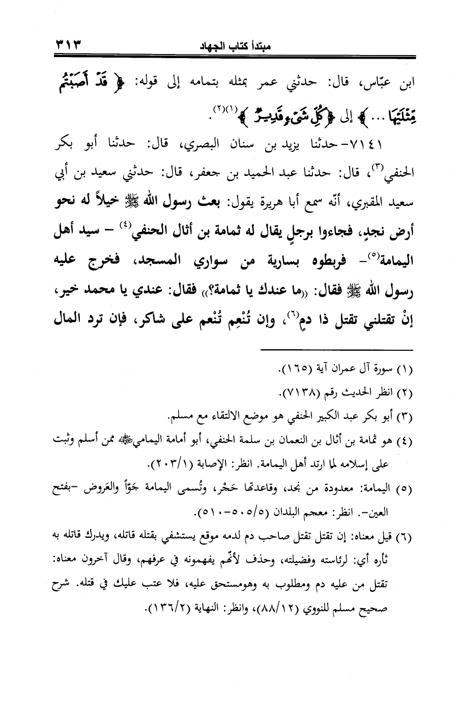 7141 - حدثنا يزيد بن سنان البصري، قال: حدثنا أبو بكر الحنفي (¬1)، قال: حدثنا عبد الحميد بن جعفر، قال: حدثني سعيد بن أبي سعيد المقبري، أنّه سمع أبا هريرة يقول: بعث رسول الله -صلى الله عليه وسلم- خيلًا له نحو أرض نجدٍ، فجاءوا برجلٍ يقال له ثمامة بن أثال الحنفي (¬2) -سيد أهل اليمامة (¬3) - فربطوه بسارية من سواري المسجد، فخرج عليه رسول الله -صلى الله عليه وسلم- فقال: "ما عندك يا ثمامة؟ " فقال: عندي يا محمد خير، إنْ تقتلني تقتل ذا دمٍ (¬4)، وإن تُنْعِم تُنْعم على شاكر، فإن ترد المال
