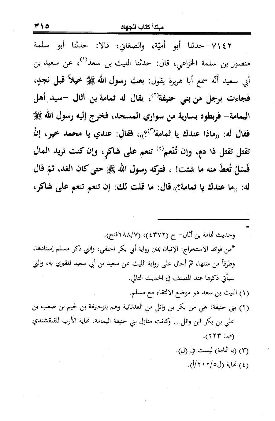 7142 - حدثنا أبو أميّة، والصغاني، قالا: حدثنا أبو سلمة منصور بن سلمة الخزاعي، قال: حدثنا الليث بن سعد (¬1)، عن سعيد بن أبي سعيد أَنّه سمع أبا هريرة يقول: بعث رسول الله -صلى الله عليه وسلم- خيلًا قبل نجدٍ، فجاءت برجل من بني حنيفة (¬2)، يقال له ثمامة بن أثال -سيد أهل اليمامة- فربطوه بسارية من سواري المسجد، فخرج إليه رسول الله -صلى الله عليه وسلم- فقال له: "ماذا عندك يا ثمامة (¬3)؟ "، فقال: عندي يا محمد خير، إنْ تقتل تقتل ذا دمٍ، وإن تُنْعم (¬4) تنعم على شاكرٍ، وإن كنت تريد المال فَسَلْ تُعطَ منه ما شئت!، فتركه رسول الله -صلى الله عليه وسلم- حتى كان الغد، ثمّ قال له: "ما عندك يا ثمامة؟ " قال: ما قلت لك: إن تنعم تنعم على شاكر،
