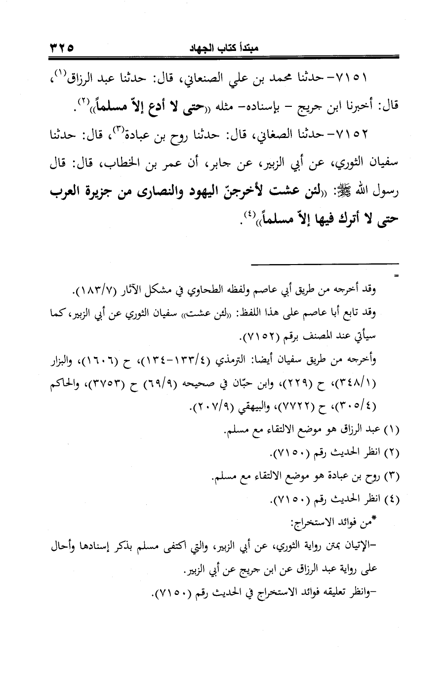 7152 - حدثنا الصغاني، قال: حدثنا روح بن عبادة (¬1)، قال: حدثَنا سفيان الثوري، عن أبي الزبير، عن جابر، أن عمر بن الخطاب، قال: قال رسول الله -صلى الله عليه وسلم-: "لئن عشت لأخرجنّ اليهود والنصارى من جزيرة العرب حتى لا أترك فيها إلّا مسلمًا" (¬2).