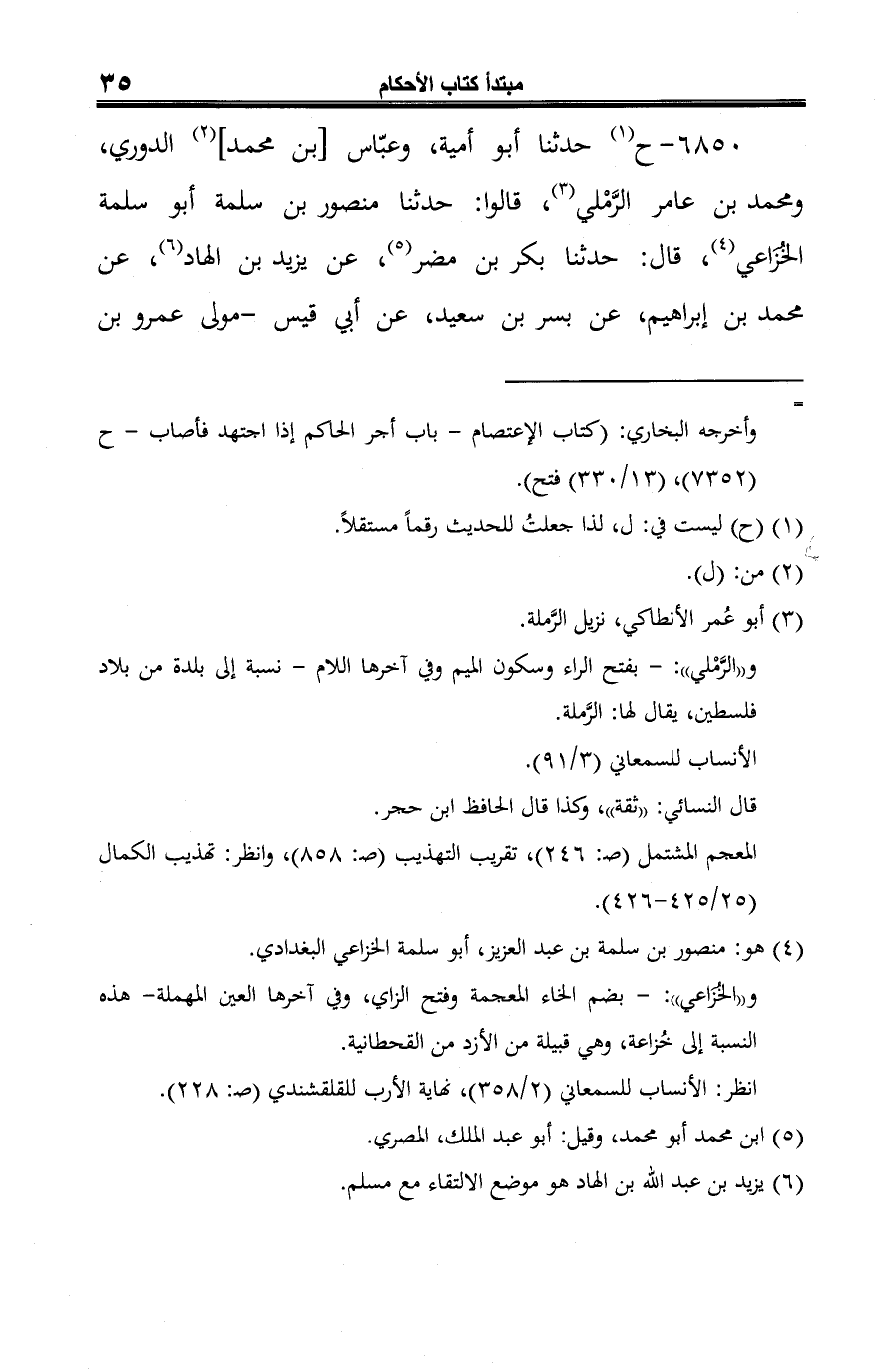 -[36]- العاص- عن عمرو بن العاص أَنّه سمع رسول الله -صلى الله عليه وسلم- يقول: "إذا حكم الحاكم فاجتهد فأصاب فله أجران، وإذا حكم فاجتهد ثمّ أخطأ فله أجر" (¬7).