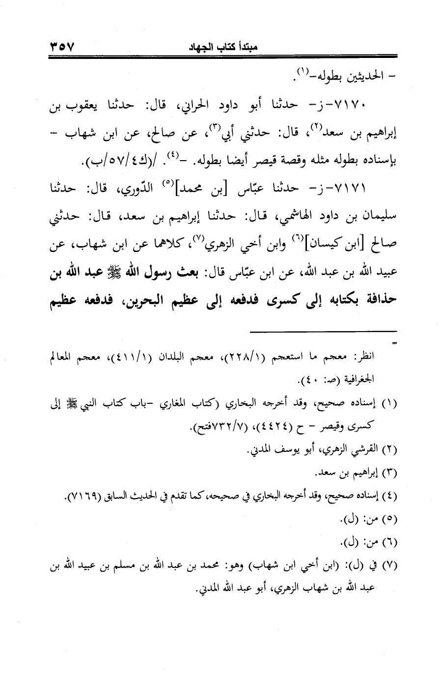 7171 - ز- حدثنا عبّاس [بن محمد] (¬1) الدّوري، قال: حدثنا سليمان بن داود الهاشمي، قال: حدثنا إبراهيم بن سعد، قال: حدثني صالح [ابن كيسان] (¬2) وابن أخي الزهري (¬3)، كلاهما عن ابن شهاب، عن عبيد الله بن عبد الله، عن ابن عبّاس قال: بعث رسول الله -صلى الله عليه وسلم- عبد الله بن حذافة بكتابه إلى كسرى فدفعه إلى عظيم البحرين، فدفعه عظيم