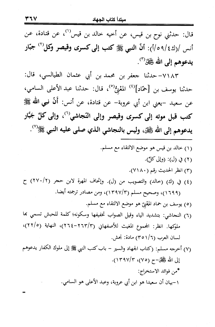 7183 - حدثنا جعفر بن محمد بن أبي عثمان الطيالسي، قال: حدثنا يوسف بن [حمّاد] (¬1) المعْنِيُّ (¬2)، قال: حدثنا عبد الأعلى السامي، عن سعيد -يعني ابن أبي عروبة- عن قتادة، عن أنس: أَنّ نبي الله -صلى الله عليه وسلم- كتب قبل موته إلى كسرى وقيصر وإلى النّجاشي (¬3)، وإلى كلِّ جَبَّار يدعوهم إلى الله - عز وجل -، وليس بالنجاشي الذي صلى عليه النبي -صلى الله عليه وسلم- (¬4).