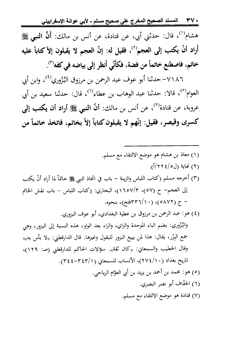 7186 - حدثنا أبو عوف عبد الرحمن بن مرزوق البُزُوري (¬1)، وابن أبي العوام (¬2)، قالا: حدثنا عبد الوهاب بن عطاء (¬3)، قال: حدثنا سعيد بن أبي عروبة، عن قتادة (¬4)، عن أنس بن مالك: أنّ النبي -صلى الله عليه وسلم- أراد أن يكتب إلى كسرى وقيصر، فقيل: إنّهم لا يقبلون كتابًا إلّا بخاتم، فاتخذ خاتمًا من