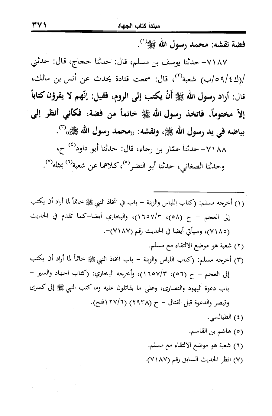 7187 - حدثنا يوسف بن مسلم، قال: حدثنا حجاج، قال: حدثني شعبة (¬1)، قال: سمعت قتادة يحدث عن أنس بن مالك، قال: أراد رسول الله -صلى الله عليه وسلم- أَنْ يكتب إلى الروم، فقيل: إنّهم لا يقرؤن كتابًا إلّا مختومًا، فاتخذ رسول الله -صلى الله عليه وسلم- خاتمًا من فضة، فكأني أنظر إلى بياضه في يد رسول الله -صلى الله عليه وسلم-، ونقشه: "محمد رسول الله -صلى الله عليه وسلم-" (¬2).