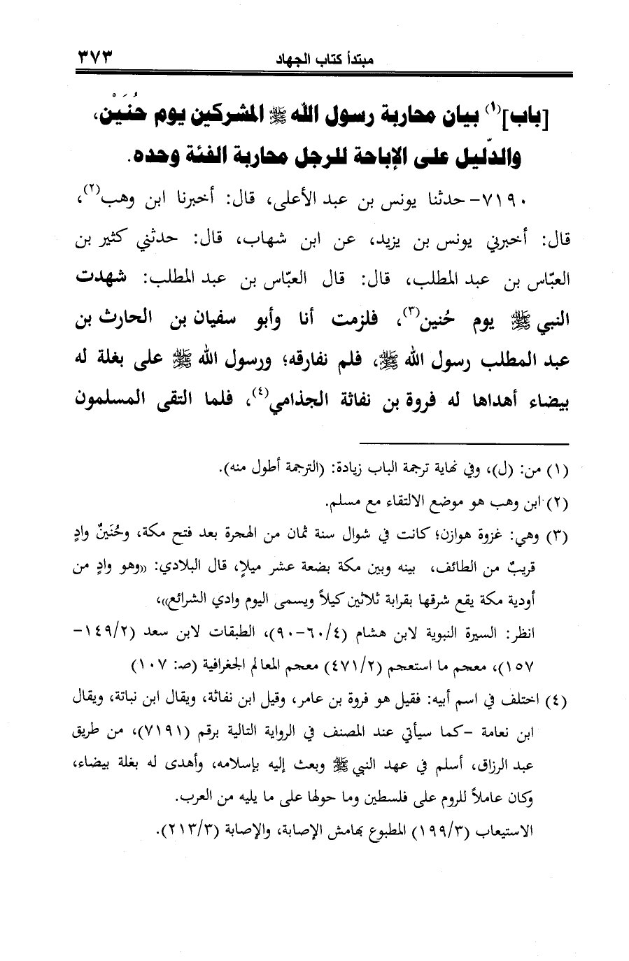 [باب] (¬1) بيان محاربة رسول الله -صلى الله عليه وسلم- المشركين يوم حُنَيْن، والدّليل على الإباحة للرجل محاربة الفئة وحده.