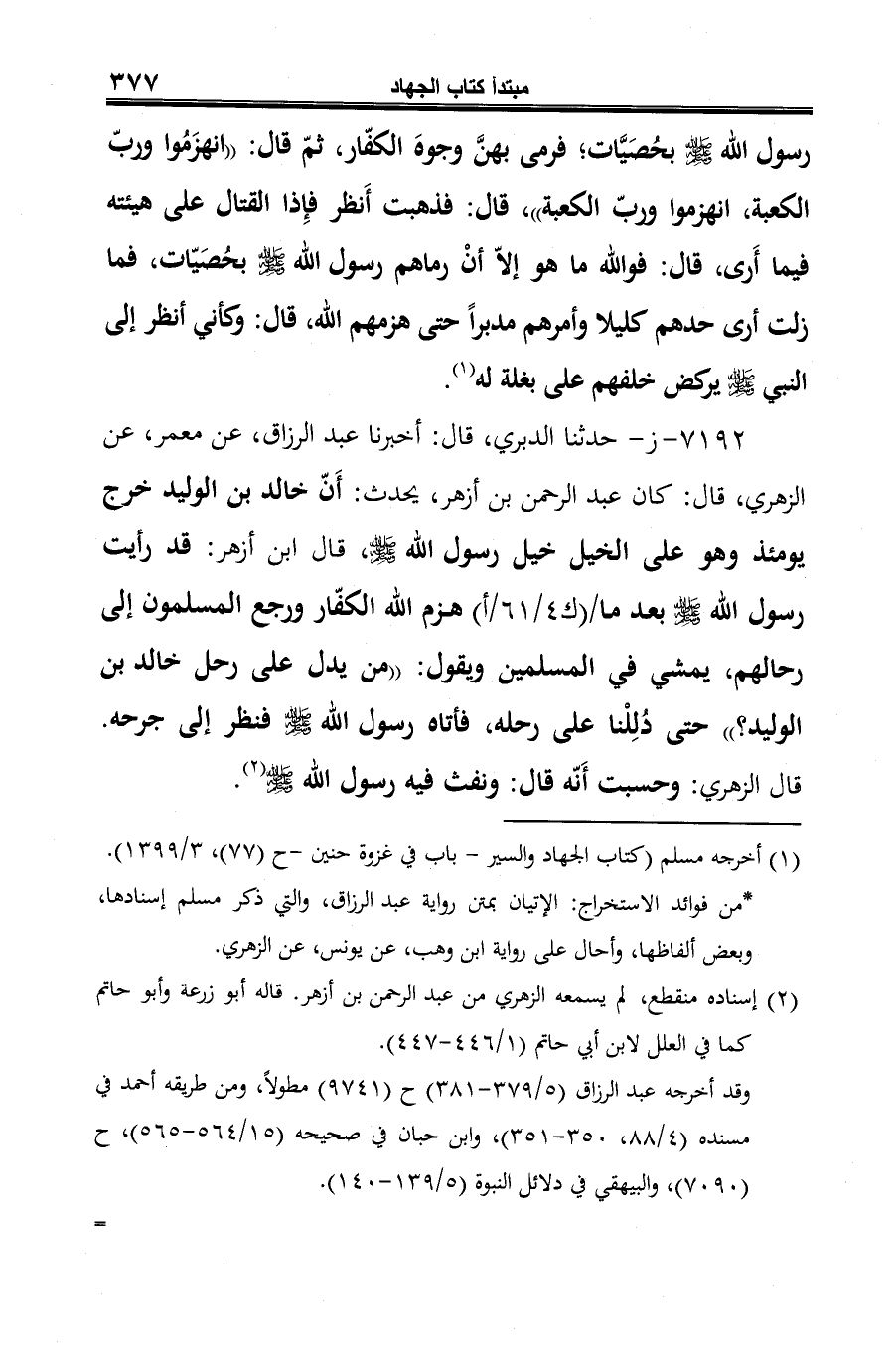 7192 - ز- حدثنا الدبري، قال: أخبرنا عبد الرزاق، عن معمر، عن الزهري، قال: كان عبد الرحمن بن أزهر، يحدث: أَنّ خالد بن الوليد خرج يومئذ وهو على الخيل خيل رسول الله -صلى الله عليه وسلم-، قال ابن أزهر: قد رأيت رسول الله -صلى الله عليه وسلم- بعد ما هزم الله الكفّار ورجع المسلمون إلى رحالهم، يمشي في المسلمين ويقول: "من يدل على رحل خالد بن الوليد؟ " حتى دُلِلْنا على رحله، فأتاه رسول الله -صلى الله عليه وسلم- فنظر إلى جرحه.